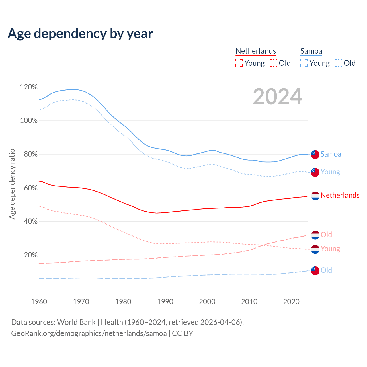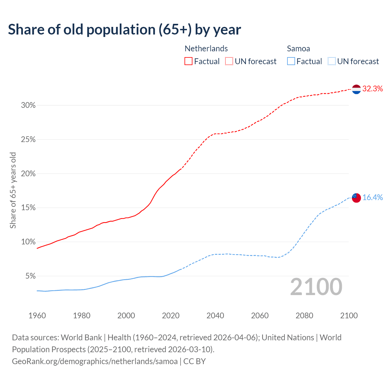 - The share of old-age demographic (65+) in the Netherlands is 20.5% vs 5.88% in Samoa.