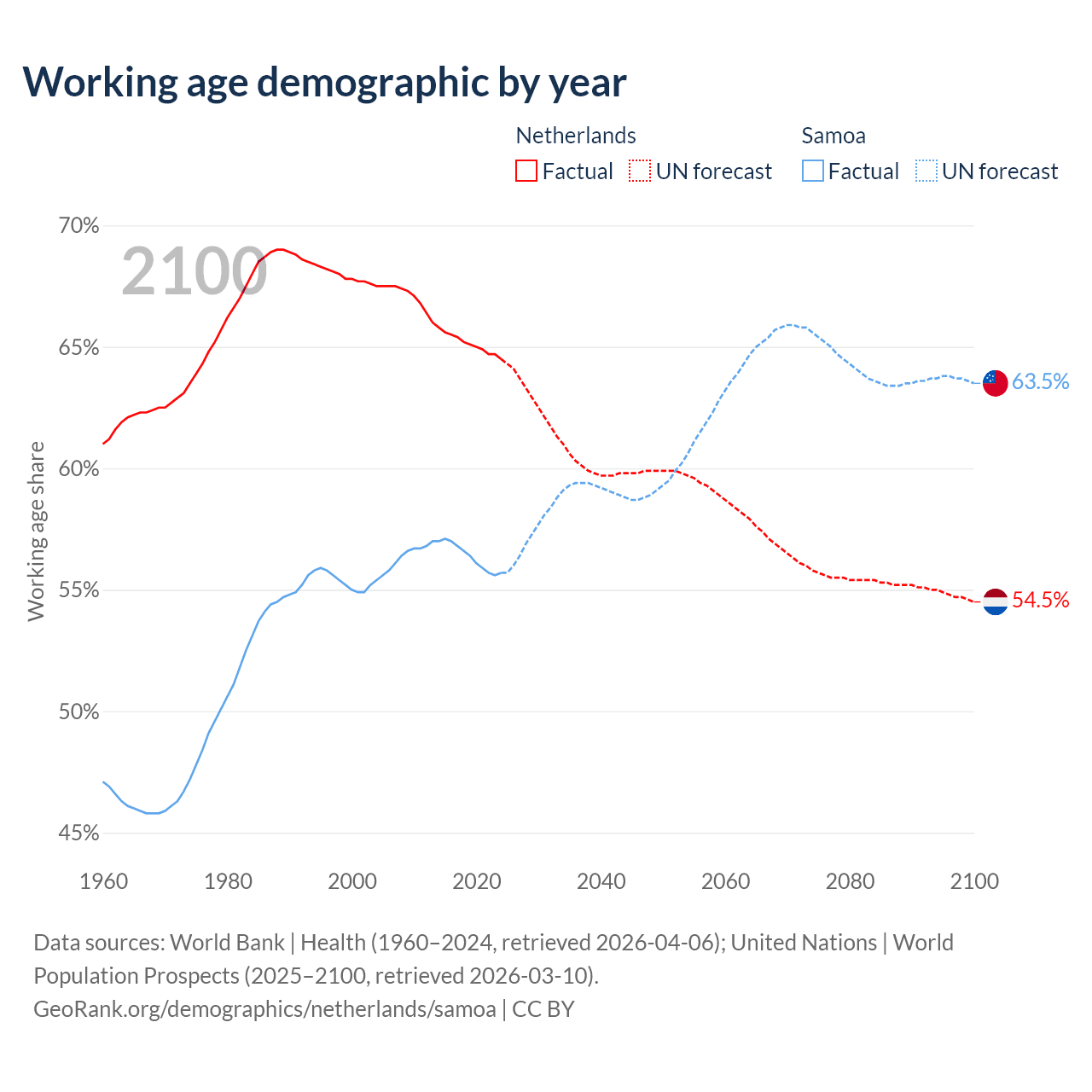 - The Netherlands has 11.8M working age adults (aged 15-64) vs 123K in Samoa.