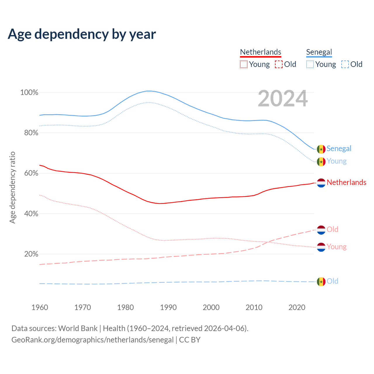 - The share of old-age demographic (65+) in the Netherlands is 20.5% vs 3.62% in Senegal.