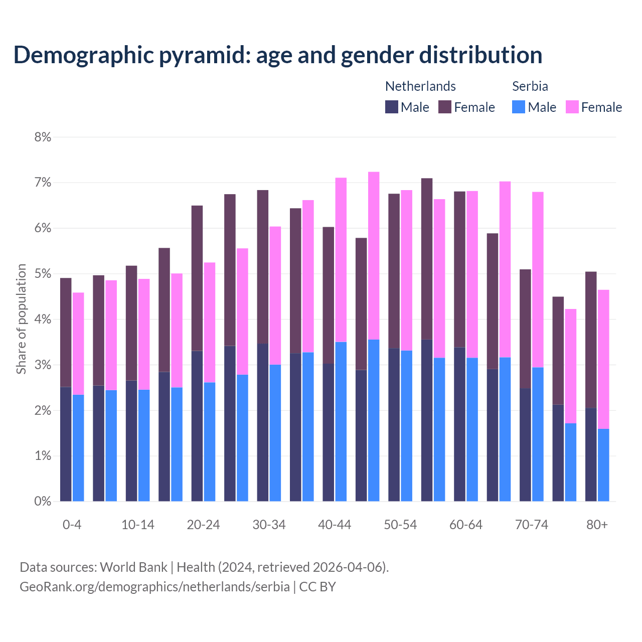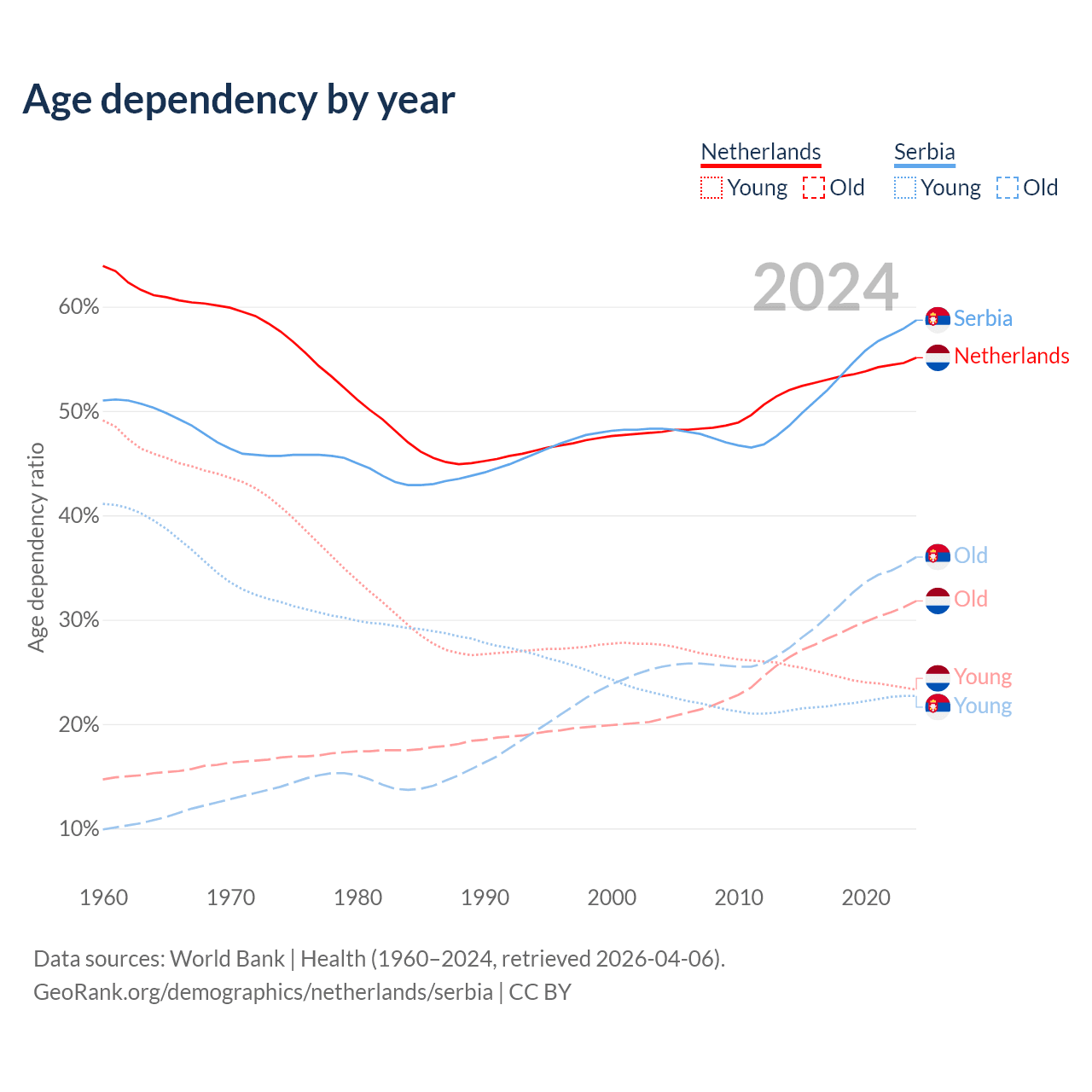 - The Netherlands is ranked 33/196 by median age (oldest to youngest) vs 15/196 for Serbia.