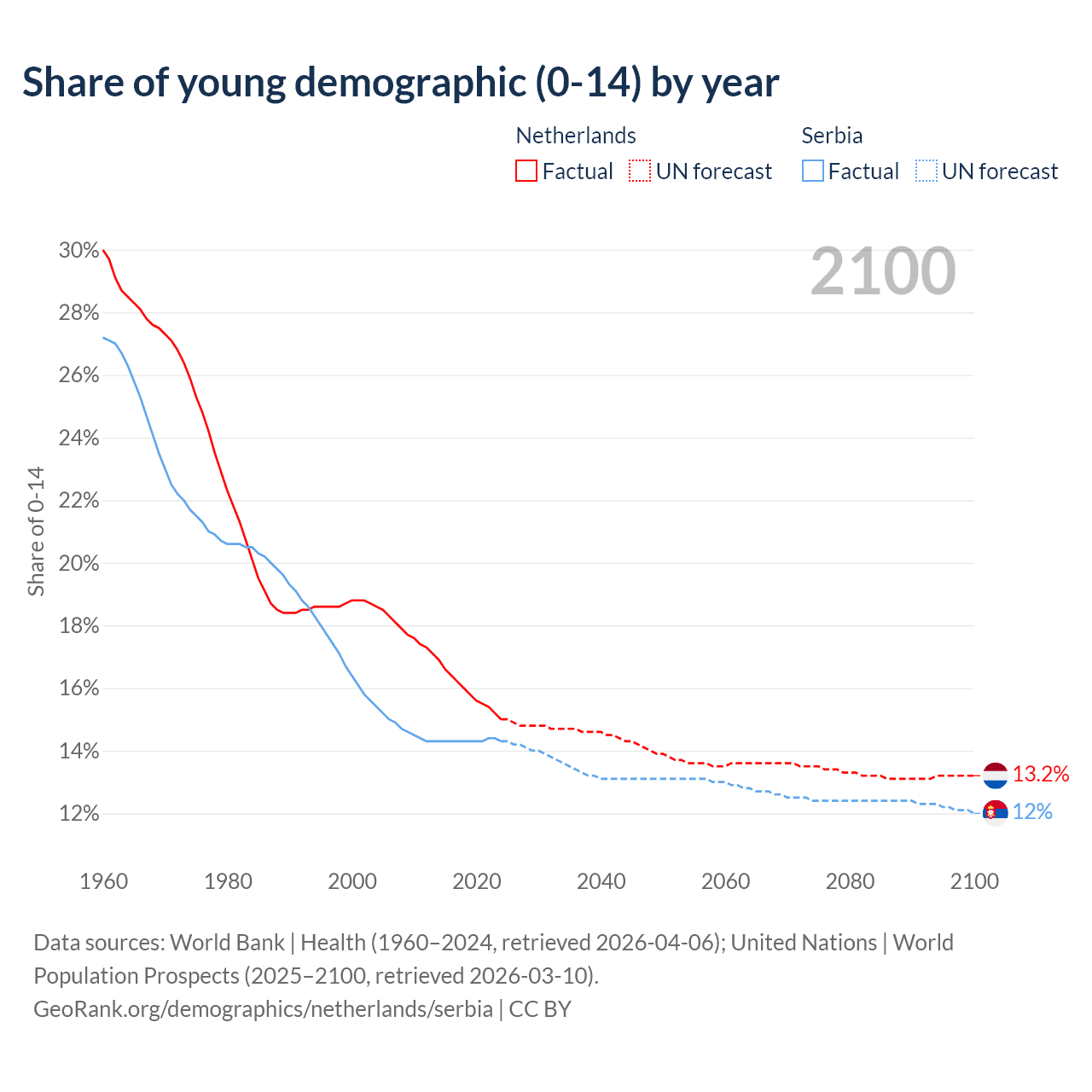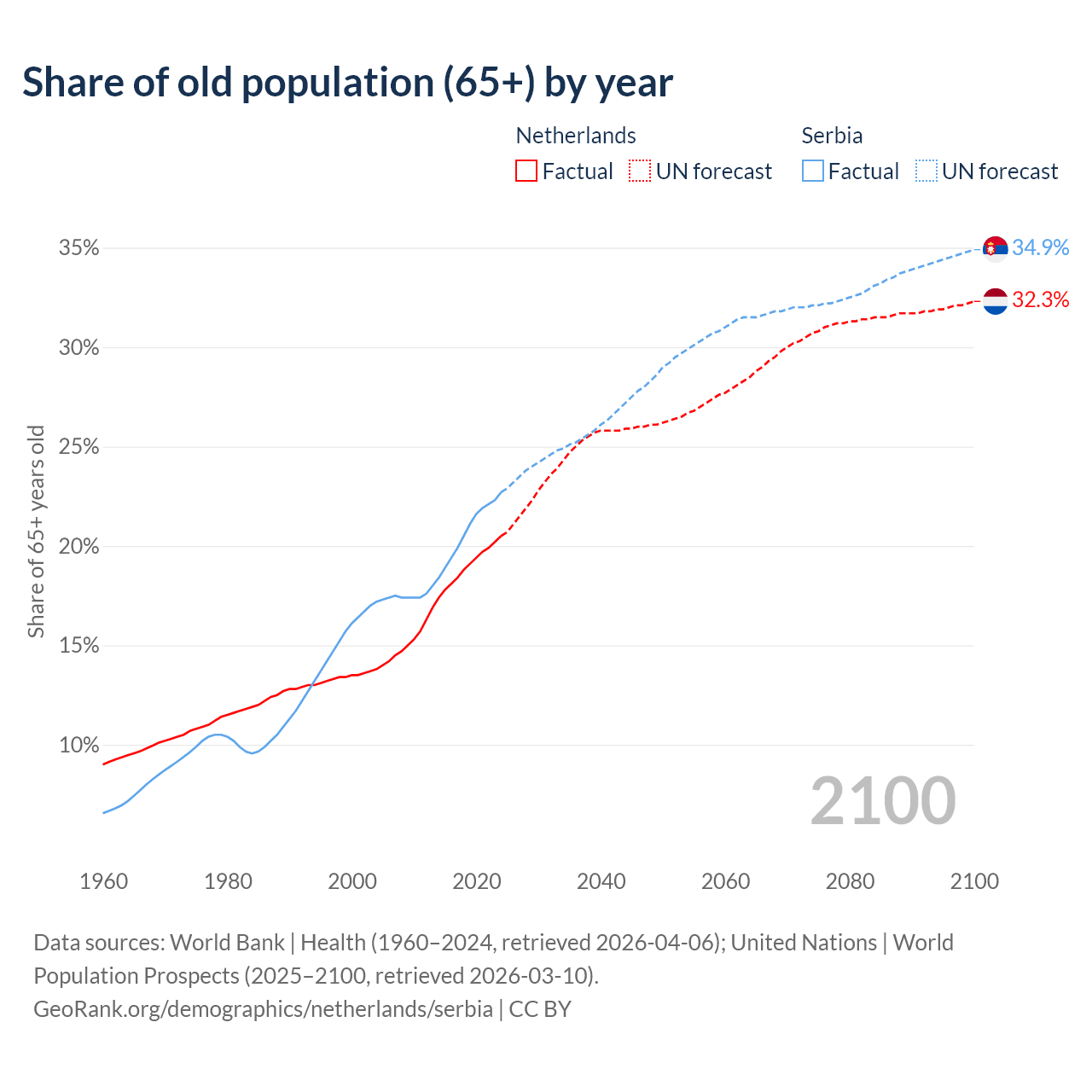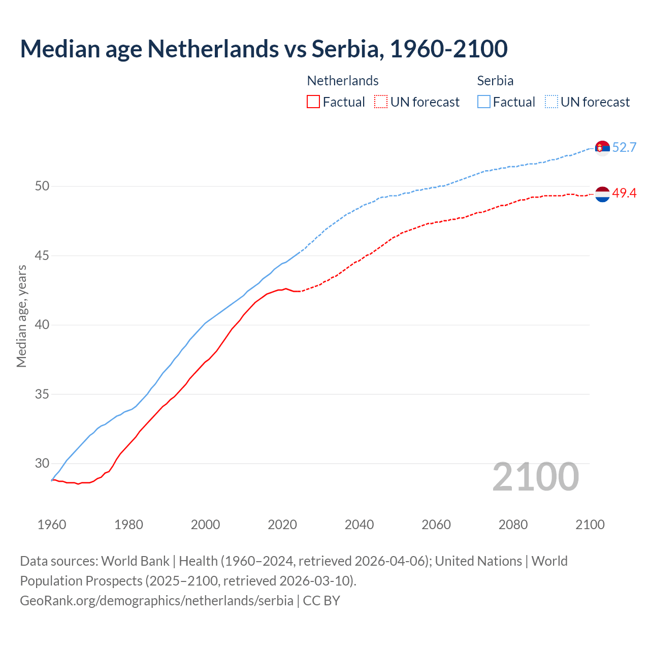 Median age Netherlands vs Serbia, 1960-2100