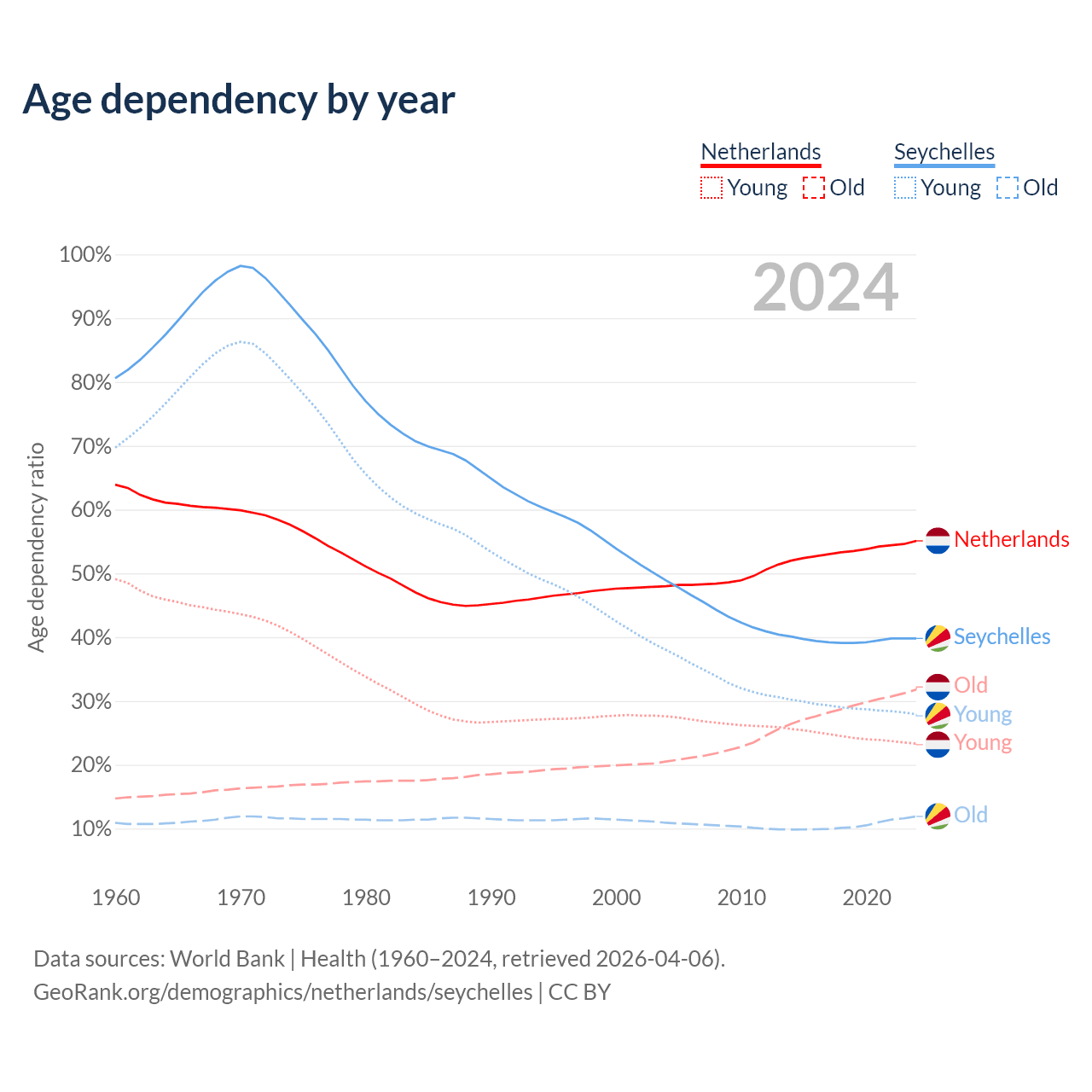 - The Netherlands is ranked 33/196 by median age (oldest to youngest) vs 76/196 for the Seychelles.
