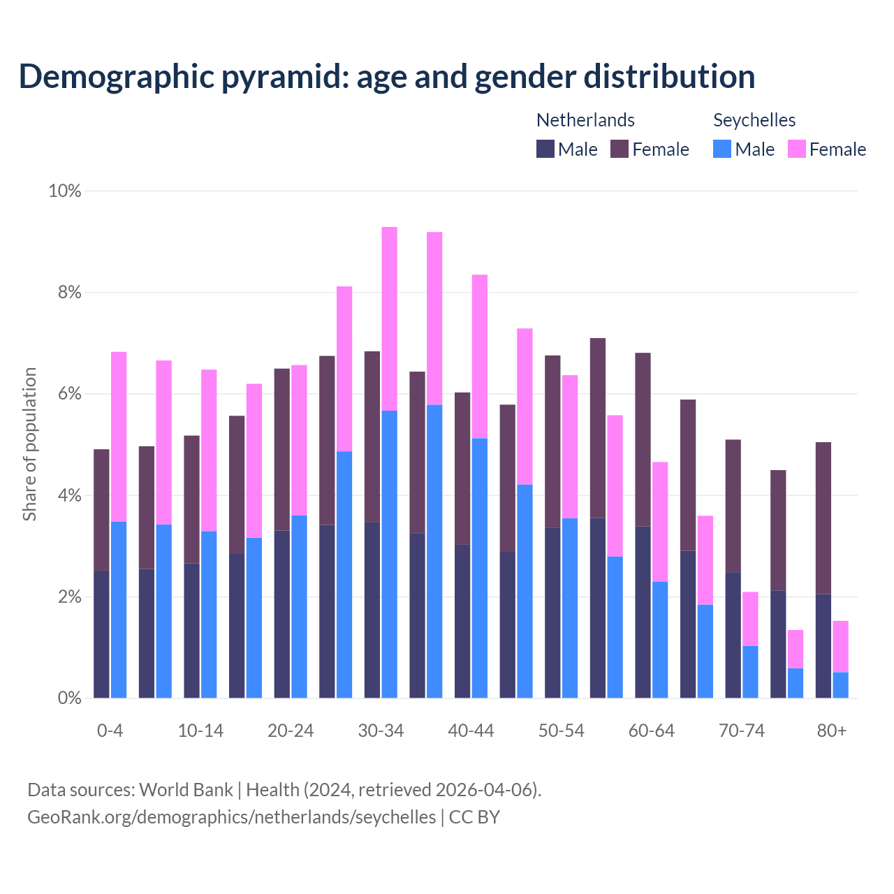 The share of older people aged 65 and over is 20.5% in the Netherlands and 8.54% in the Seychelles. Life expectancy in the Netherlands compared to the Seychelles .