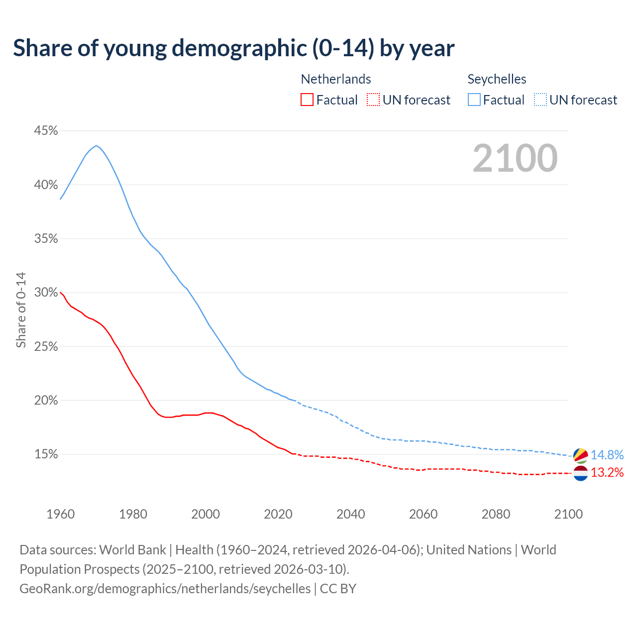 - The share of young demographic (0-15 years old) in the Netherlands is 15% vs 20% in the Seychelles.