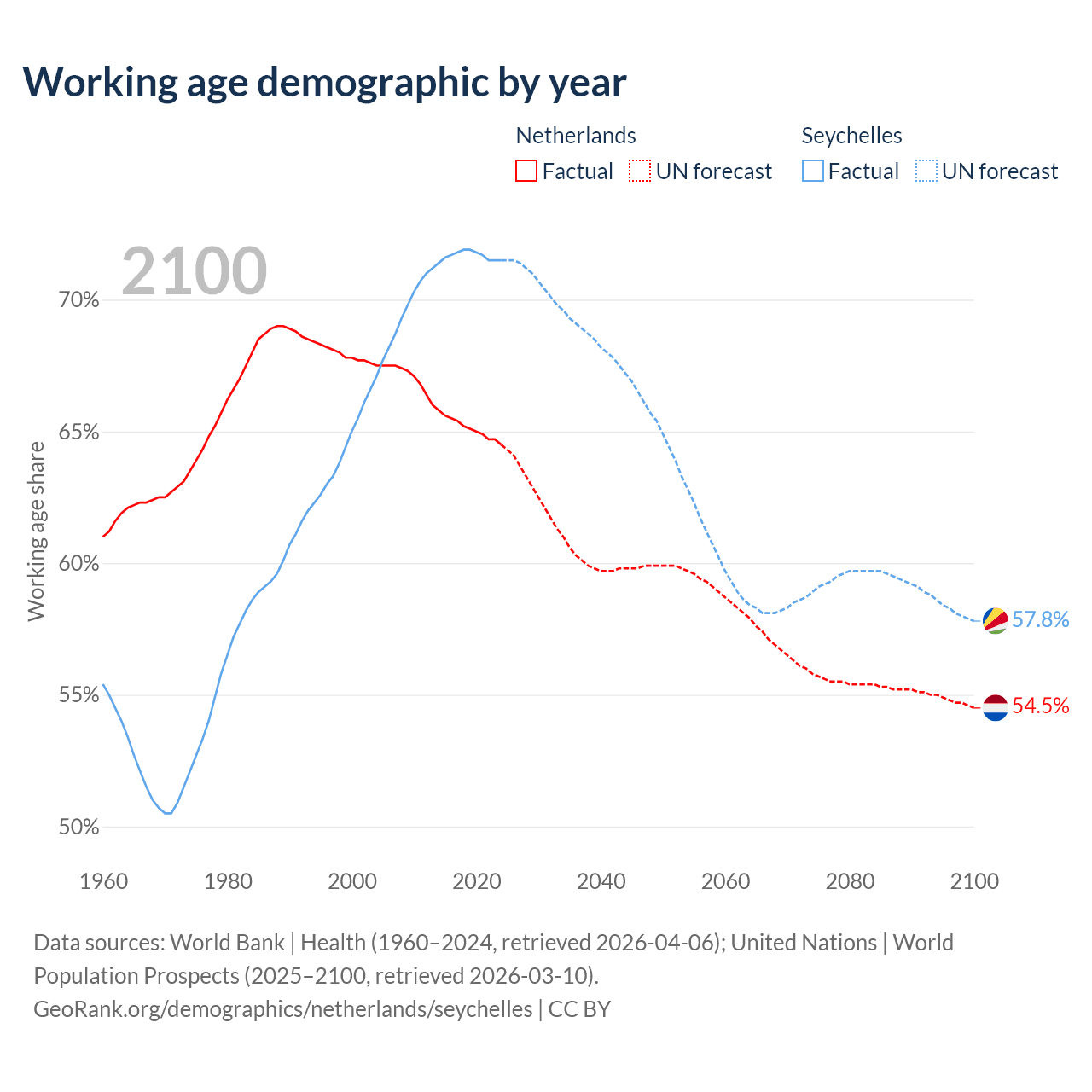 - The Netherlands has 11.8M working age adults (aged 15-64) vs 90.3K in the Seychelles.