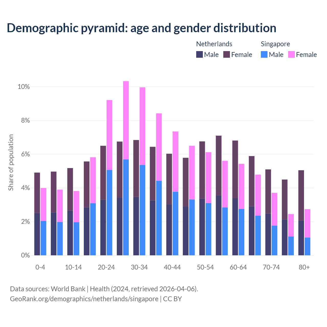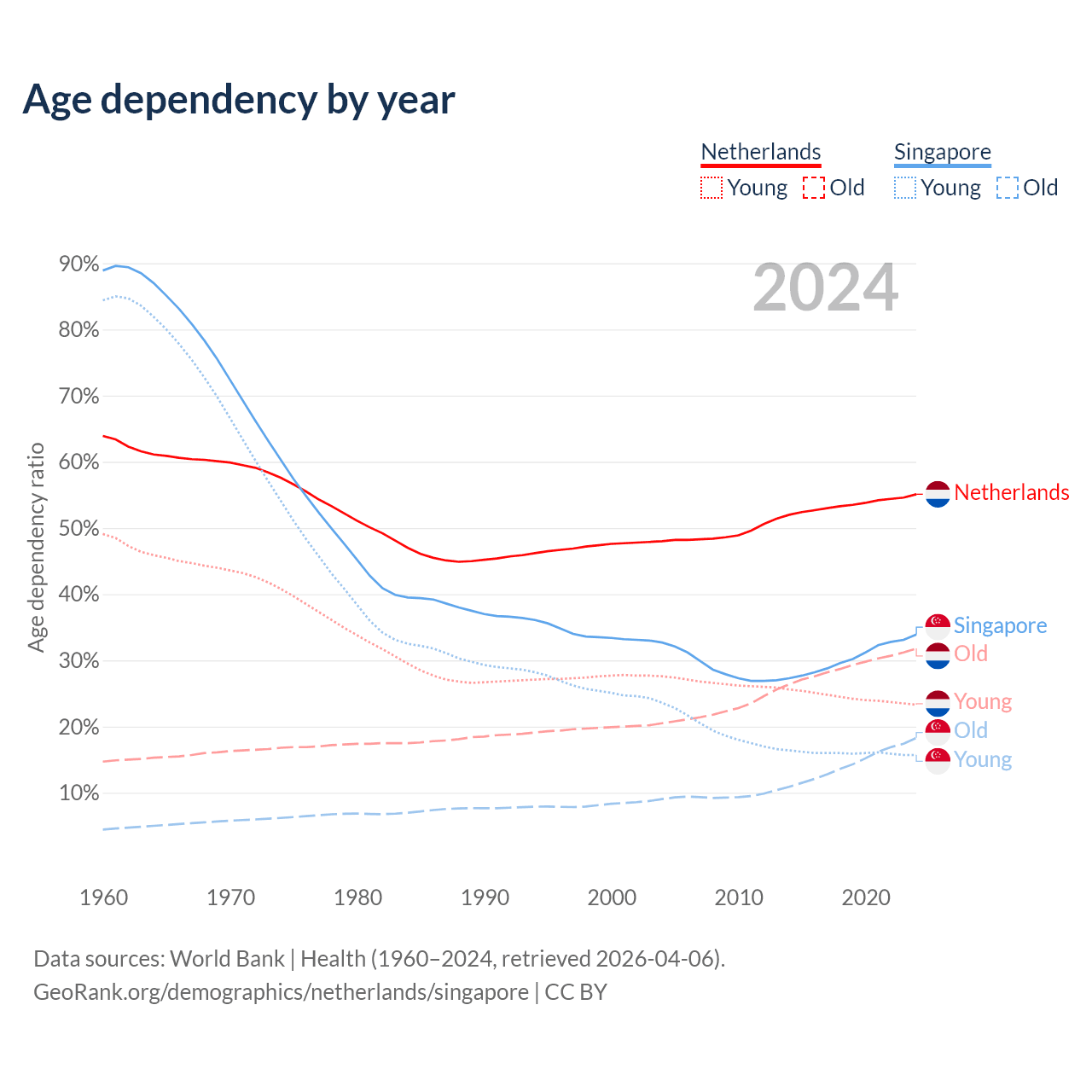 - The Netherlands is ranked 33/196 by median age (oldest to youngest) vs 68/196 for Singapore.