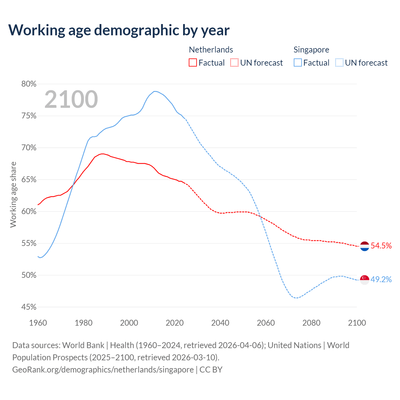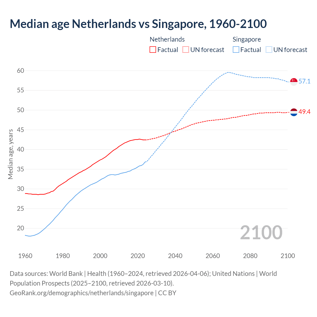 Median age Netherlands vs Singapore, 1960-2100