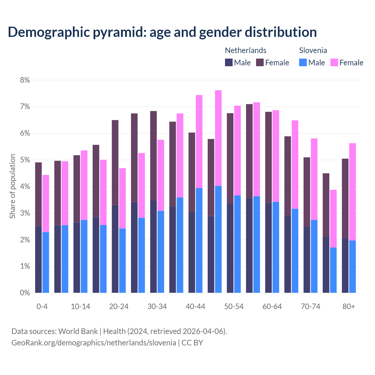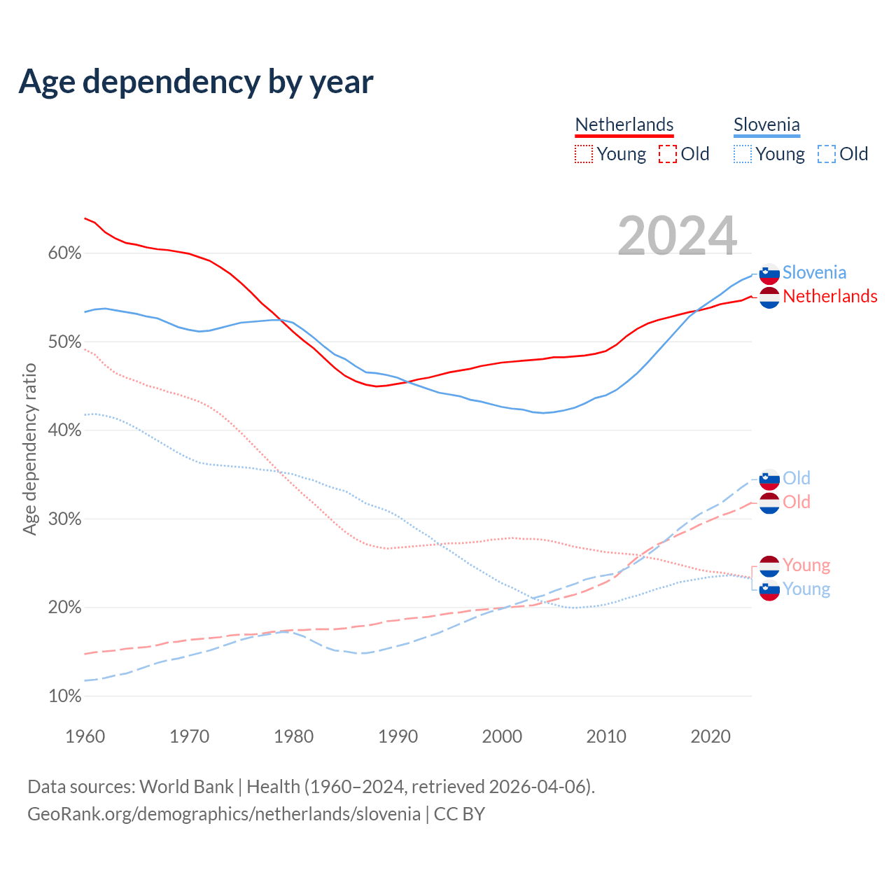 - The Netherlands is ranked 33/196 by median age (oldest to youngest) vs 14/196 for Slovenia.