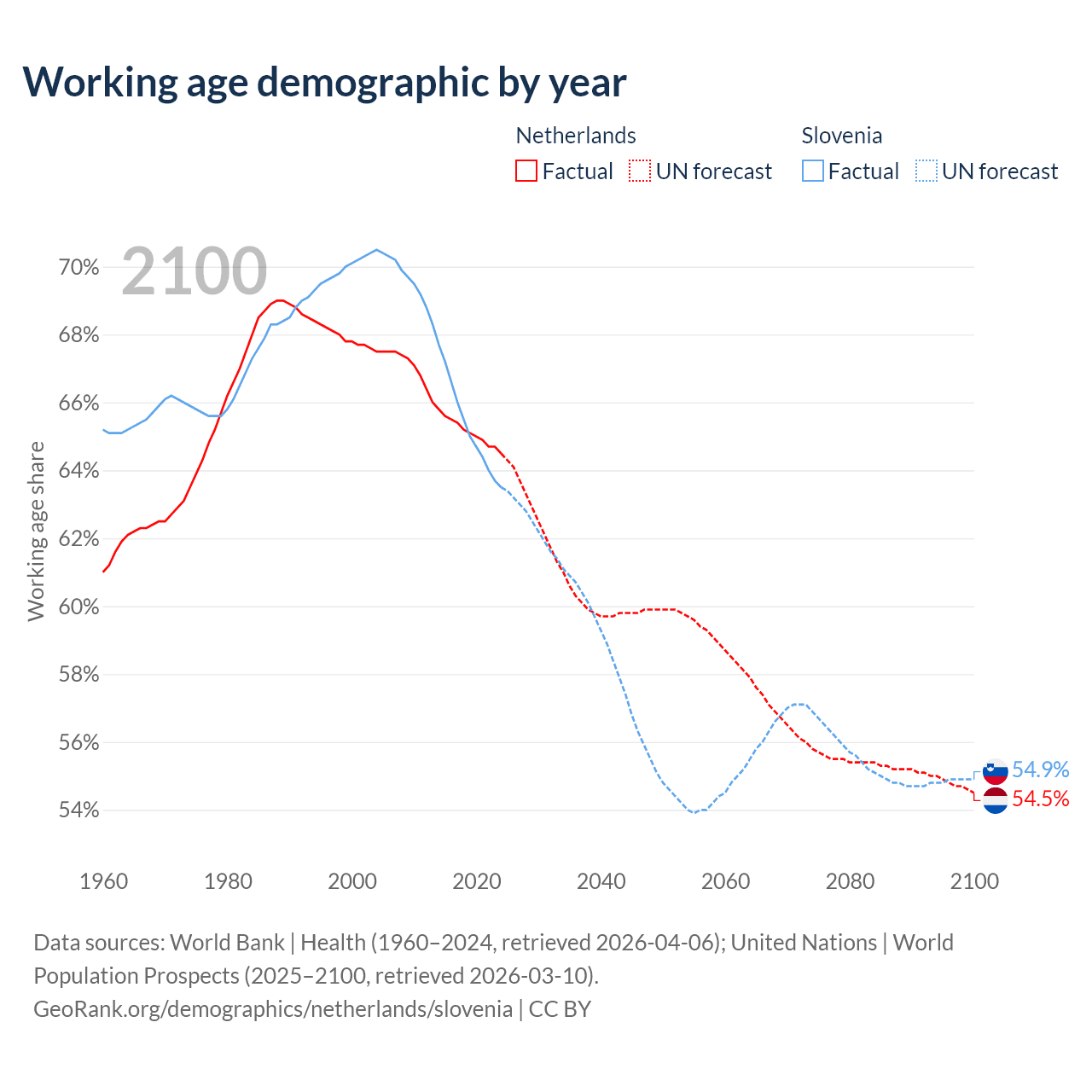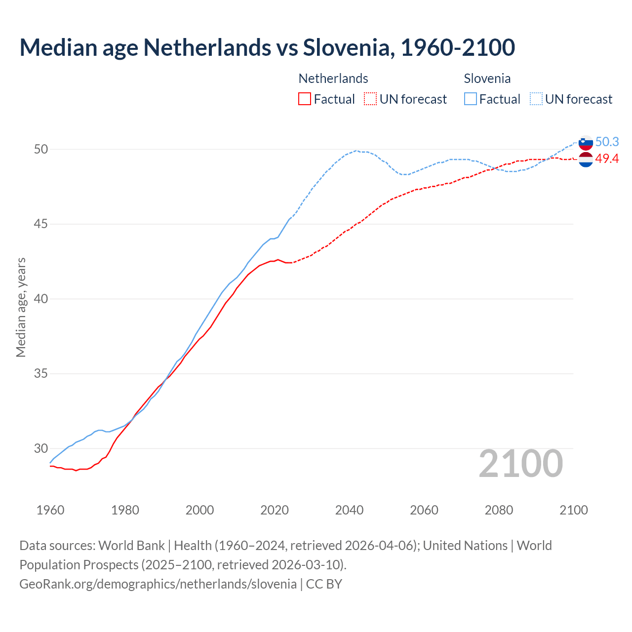 Median age Netherlands vs Slovenia, 1960-2100