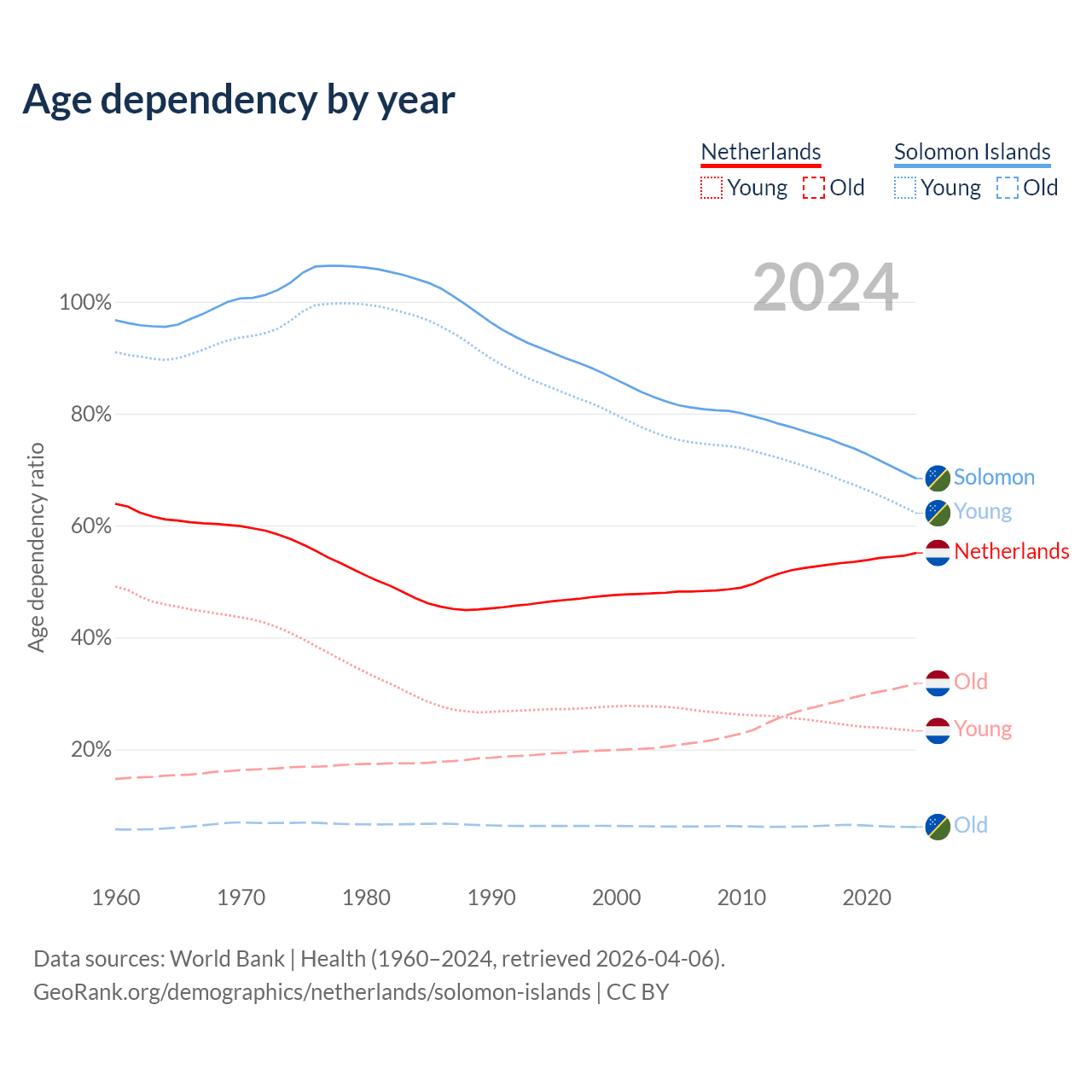- The Netherlands is ranked 33/196 by median age (oldest to youngest) vs 153/196 for the Solomon Islands.