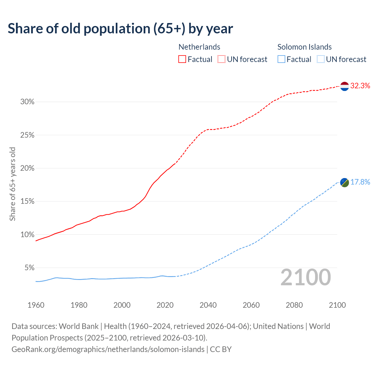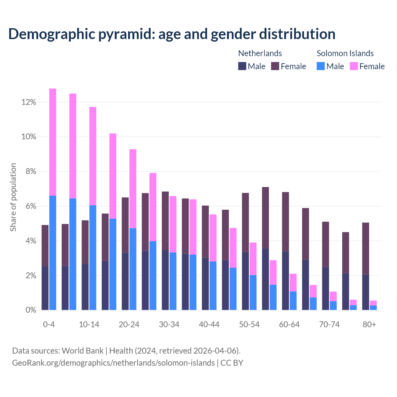 - The share of old-age demographic (65+) in the Netherlands is 20.5% vs 3.64% in the Solomon Islands.