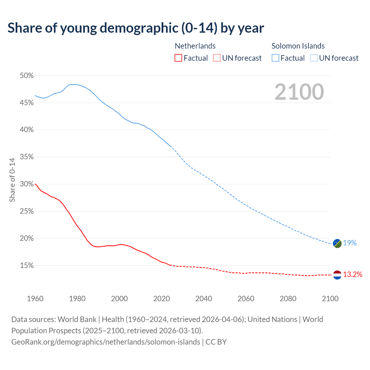 - The share of young demographic (0-15 years old) in the Netherlands is 15% vs 37% in the Solomon Islands.