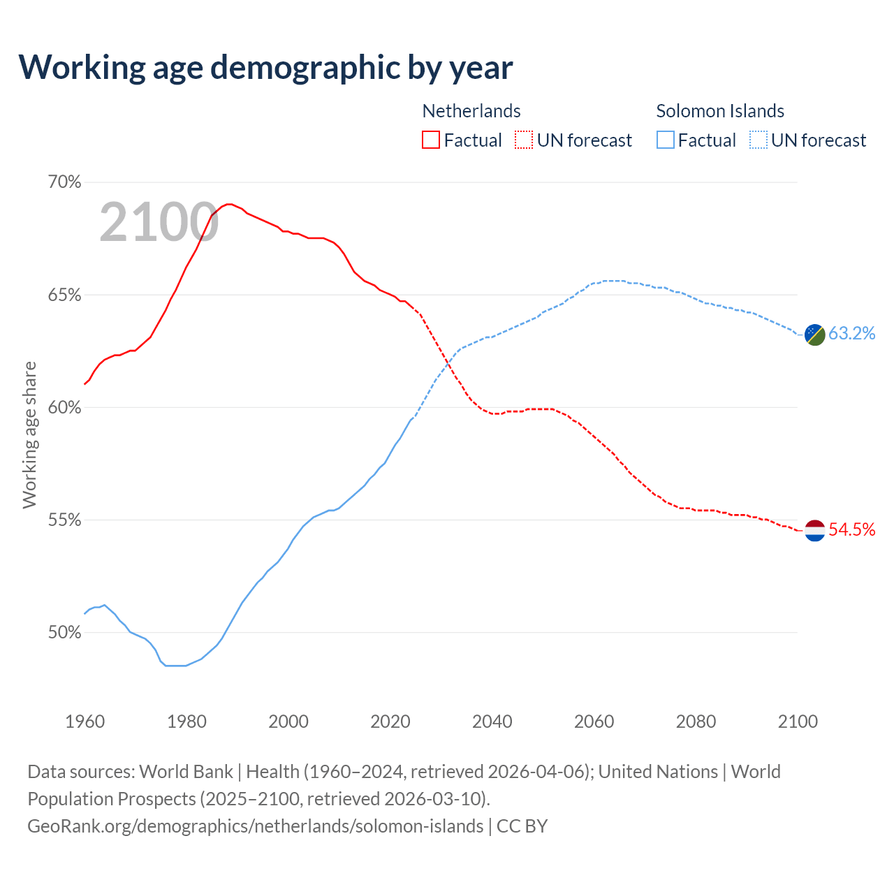Median age Netherlands vs Solomon Islands, 1960-2100