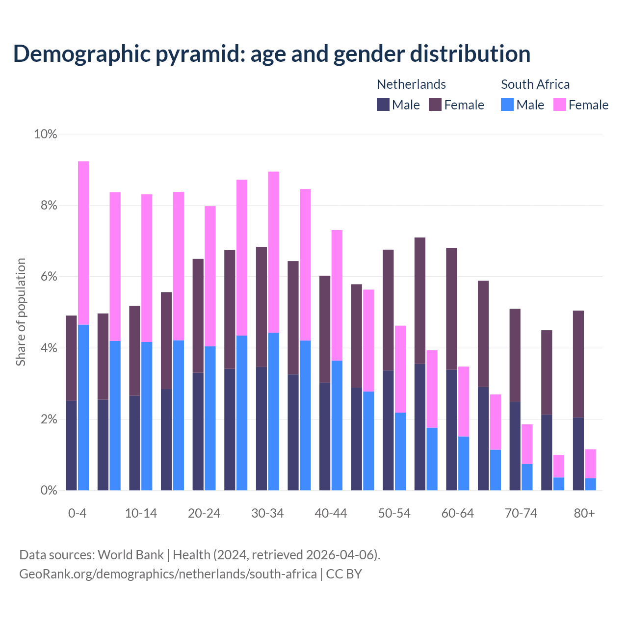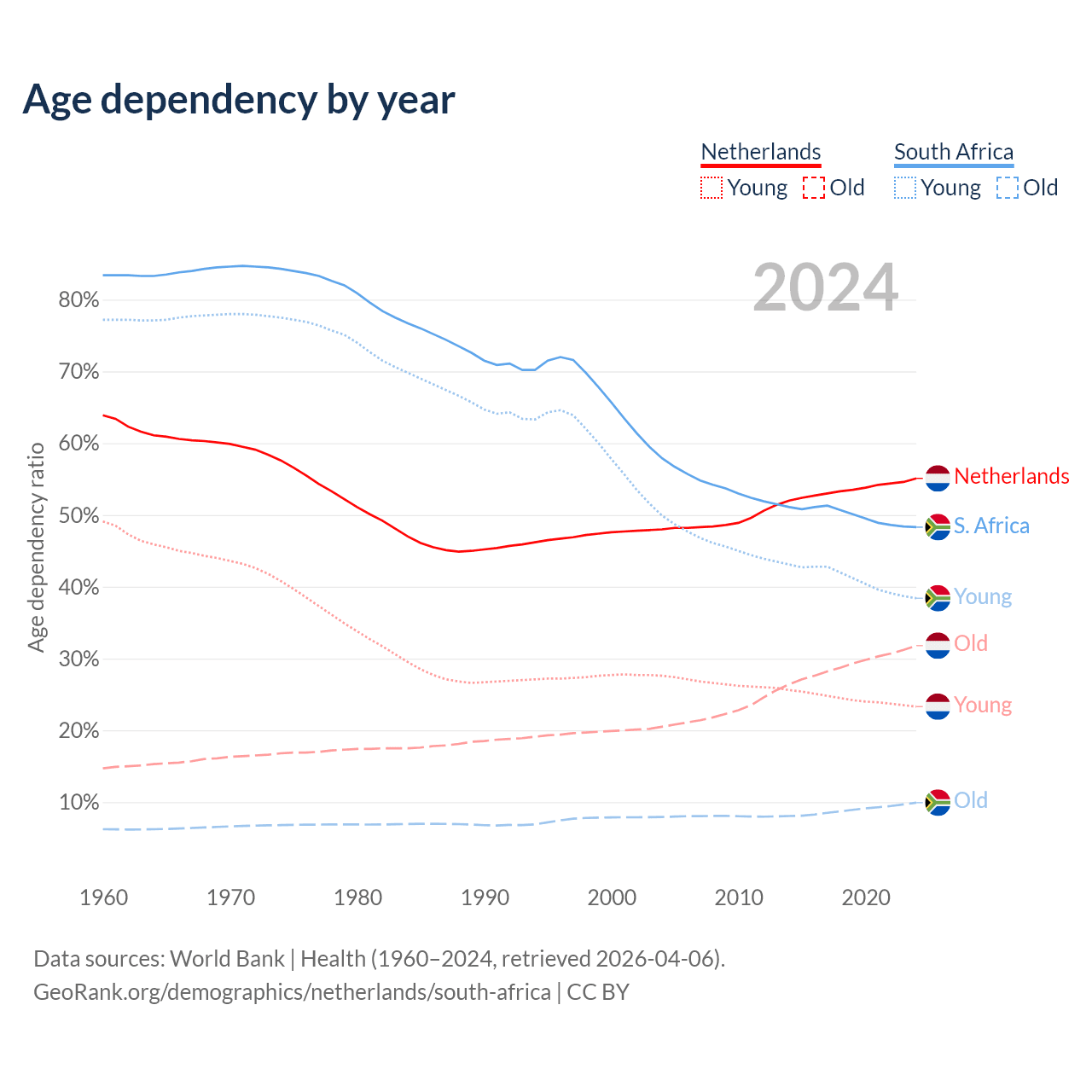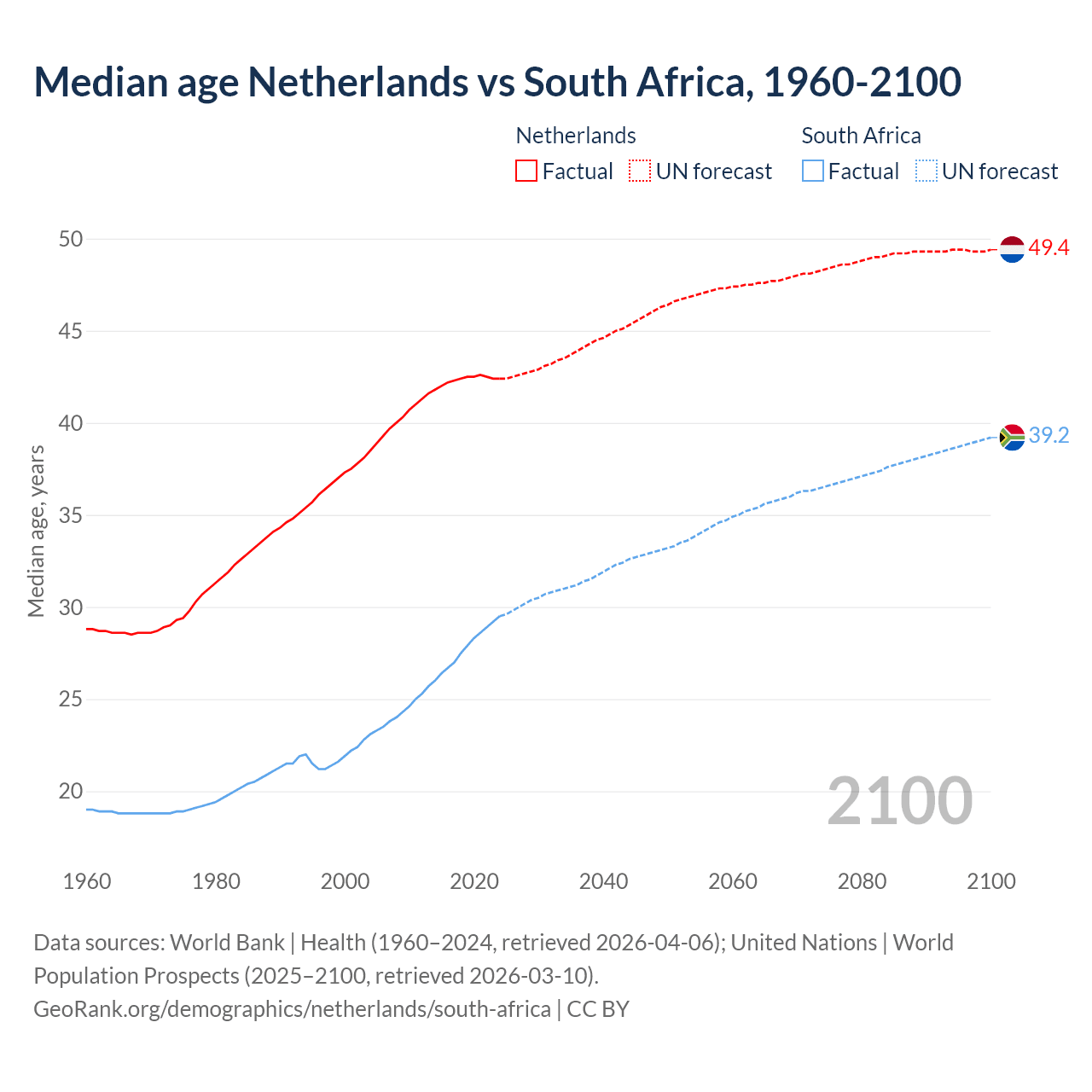 - The Netherlands is ranked 33/196 by median age (oldest to youngest) vs 107/196 for South Africa.