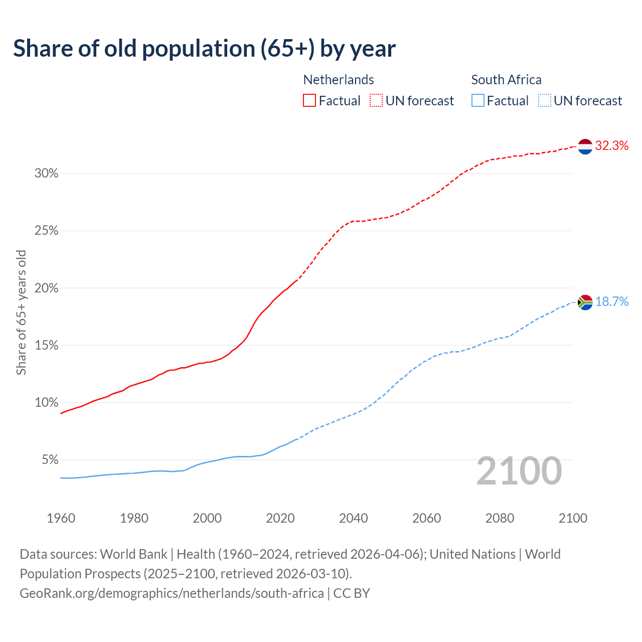 The share of older people aged 65 and over is 20.5% in the Netherlands and 6.69% in South Africa. Life expectancy in the Netherlands compared to South Africa .