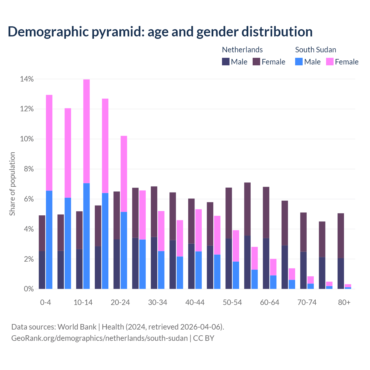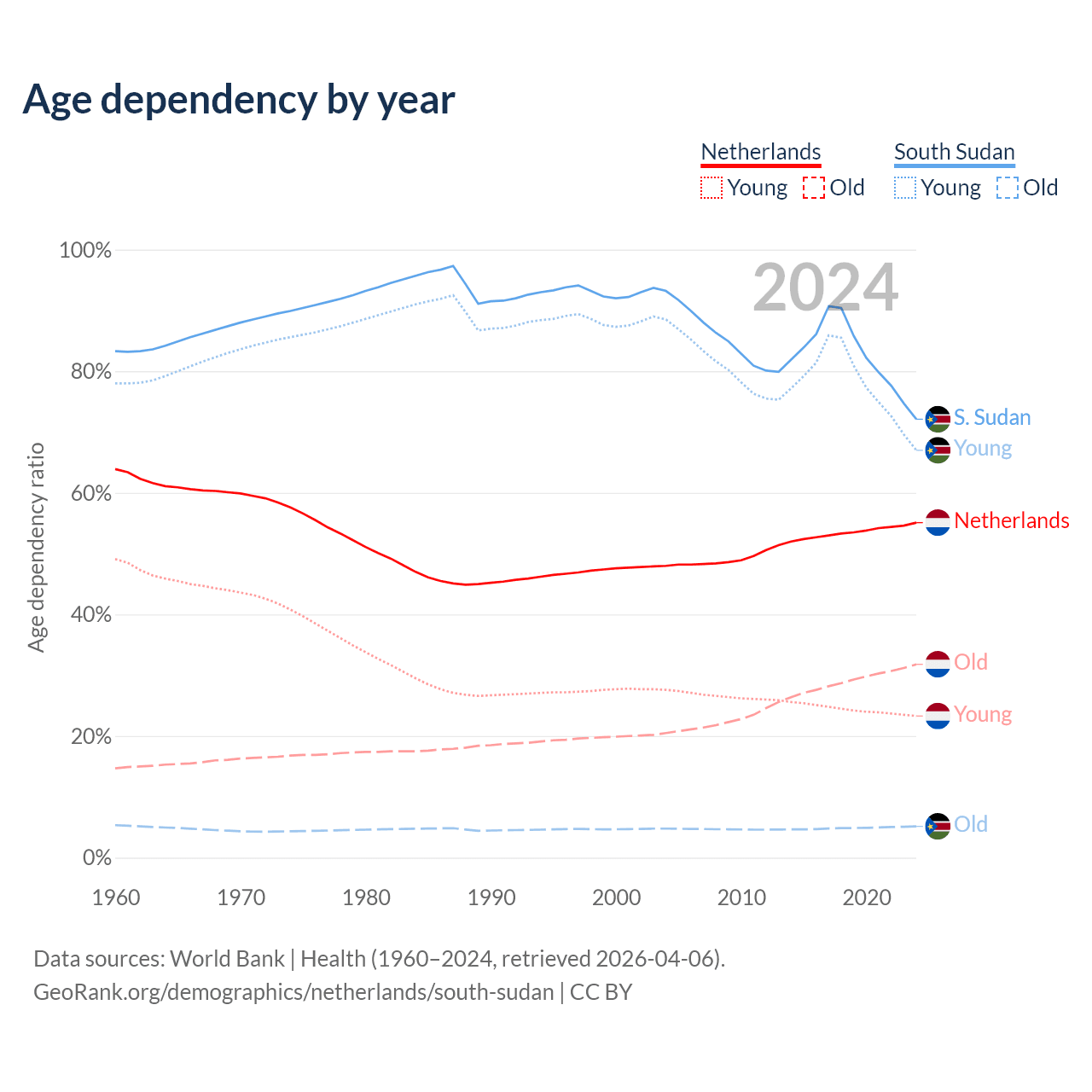 - The Netherlands is ranked 33/196 by median age (oldest to youngest) vs 173/196 for South Sudan.