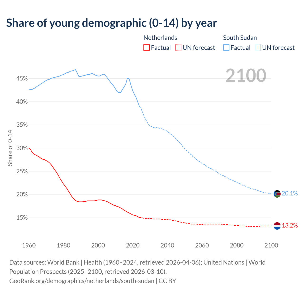- The share of young demographic (0-15 years old) in the Netherlands is 15% vs 38.9% in South Sudan.