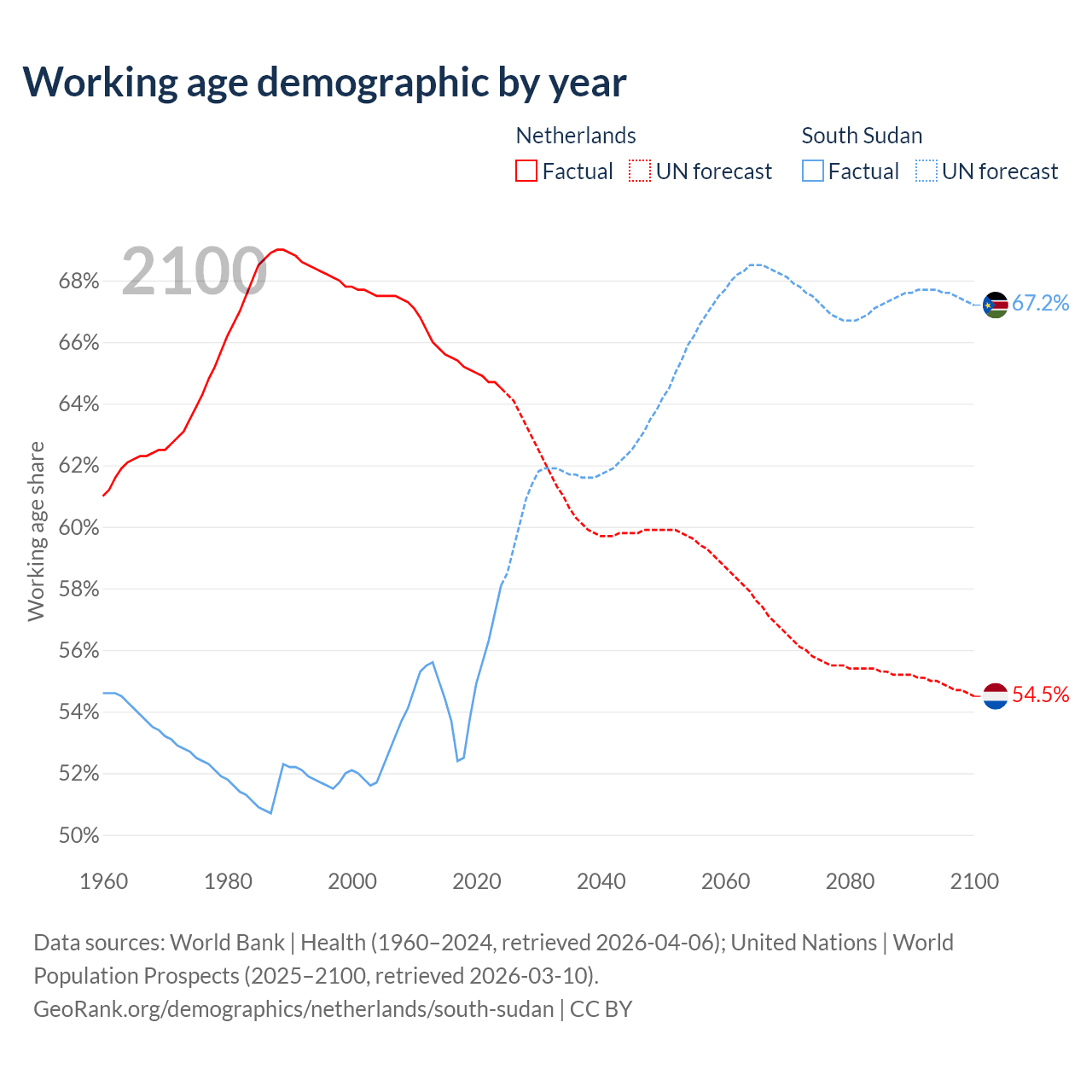 - The Netherlands has 11.8M working age adults (aged 15-64) vs 7.27M in South Sudan.