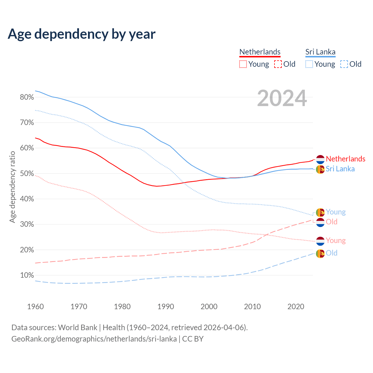 - The Netherlands is ranked 33/196 by median age (oldest to youngest) vs 81/196 for Sri Lanka.