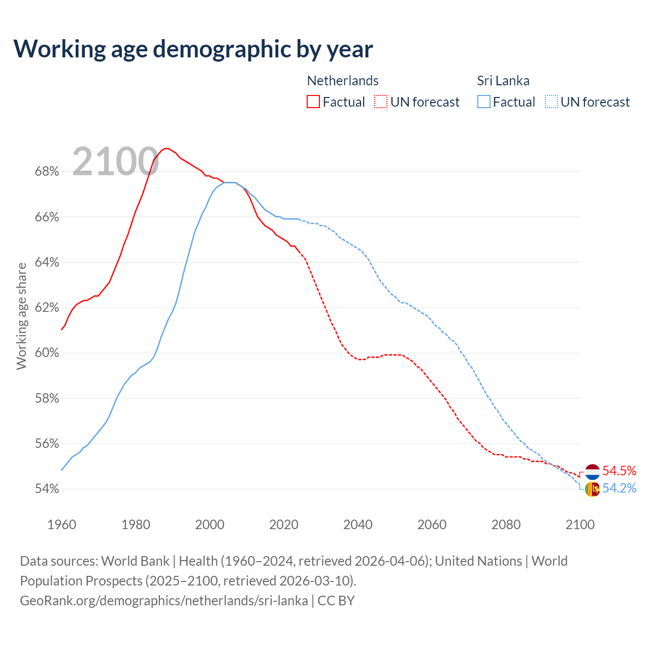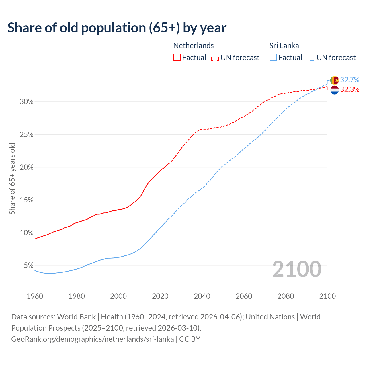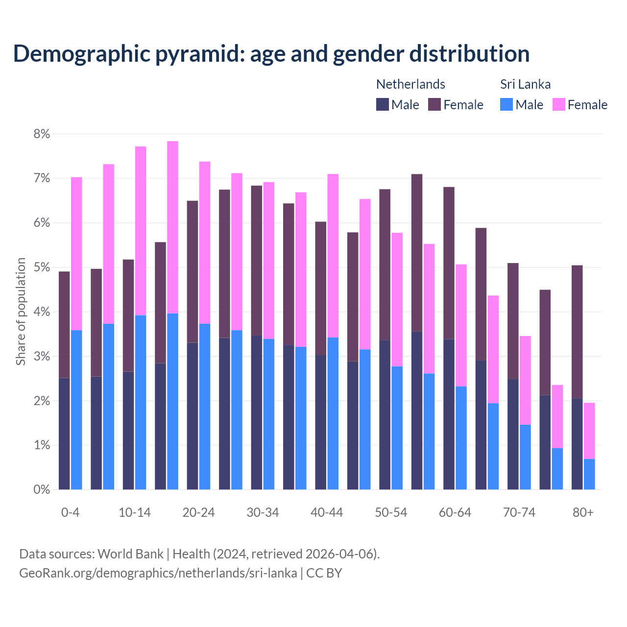 - The share of old-age demographic (65+) in the Netherlands is 20.5% vs 12.1% in Sri Lanka.