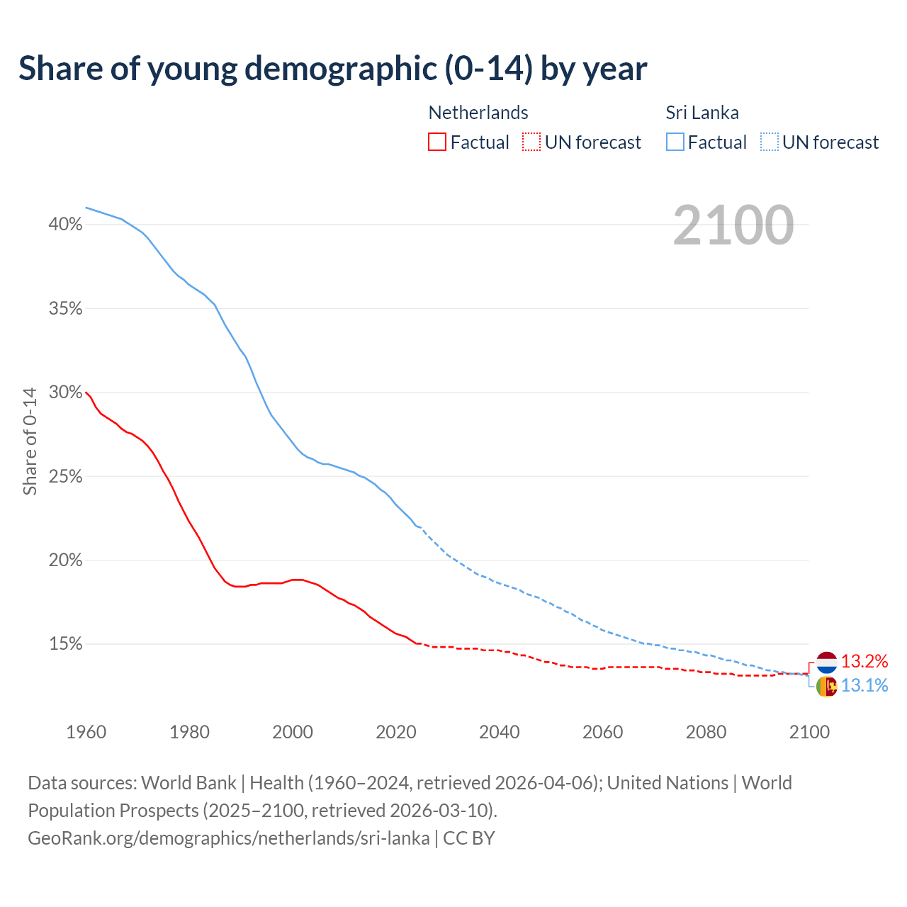 - The share of young demographic (0-15 years old) in the Netherlands is 15% vs 22% in Sri Lanka.