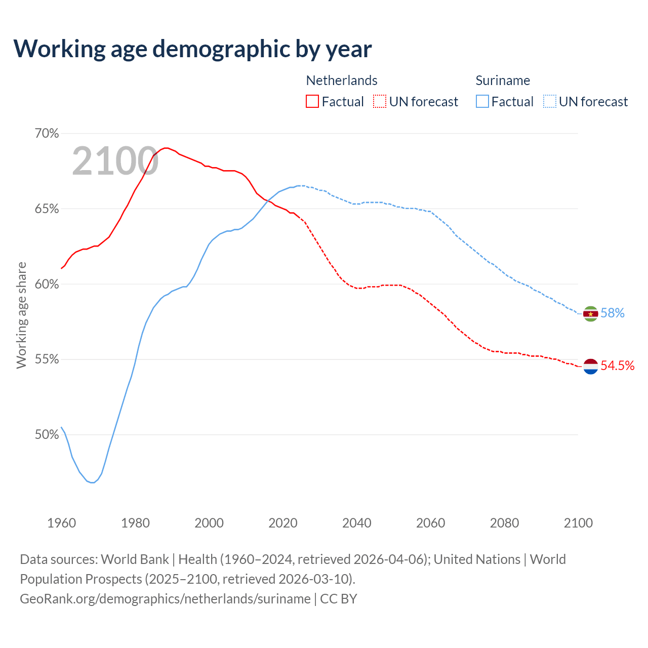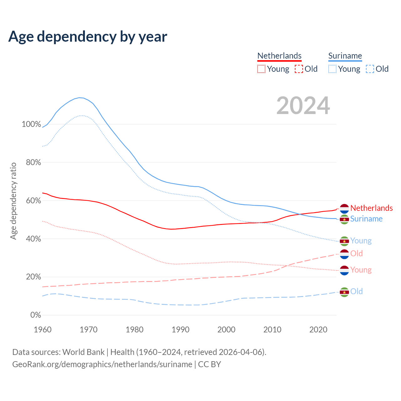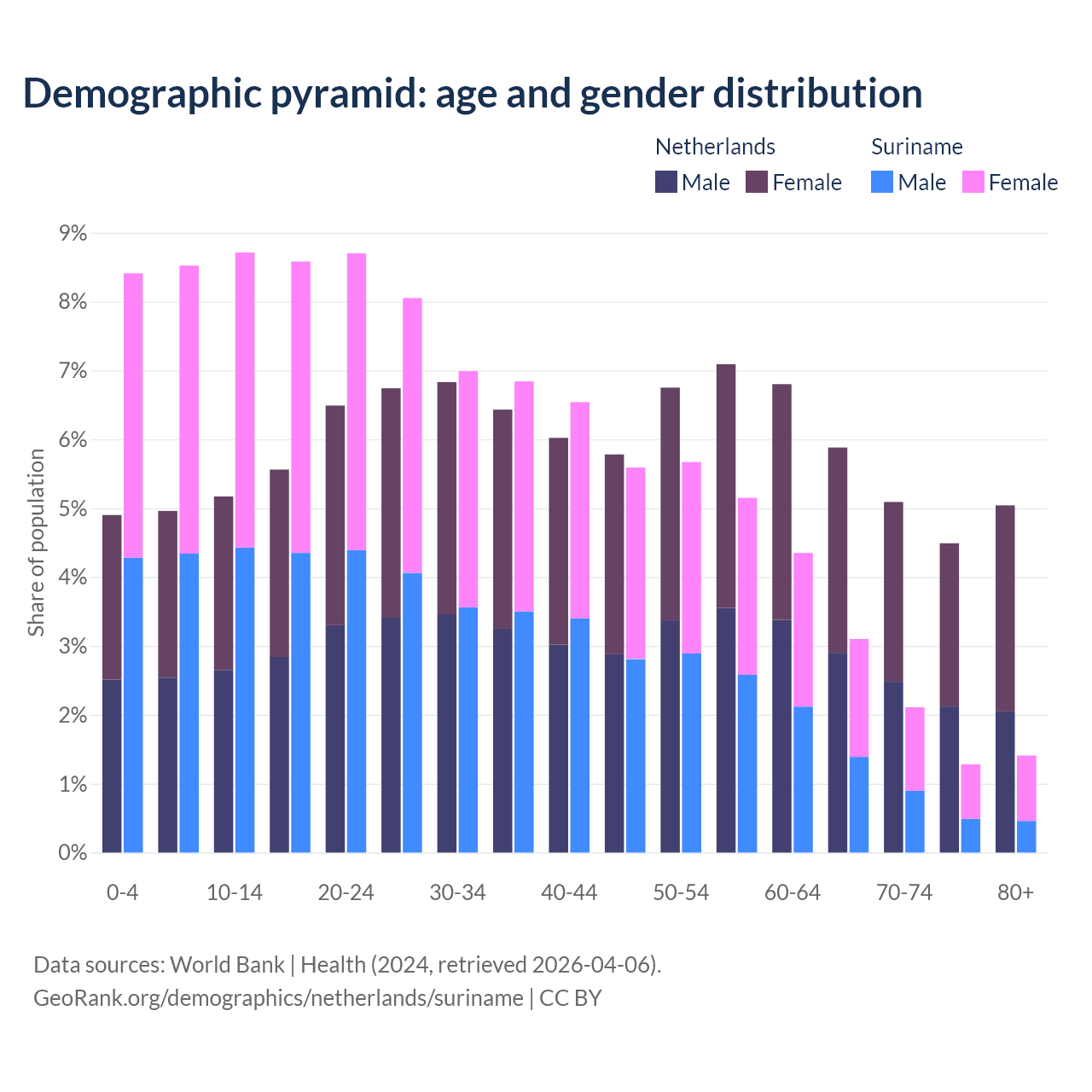 - The share of old-age demographic (65+) in the Netherlands is 20.5% vs 7.9% in Suriname.