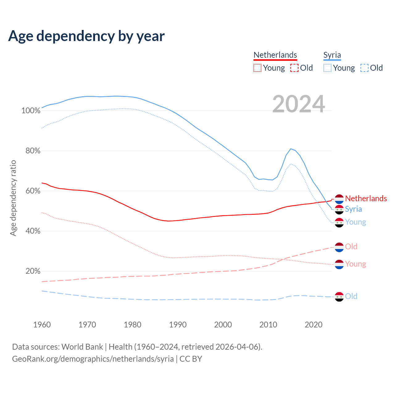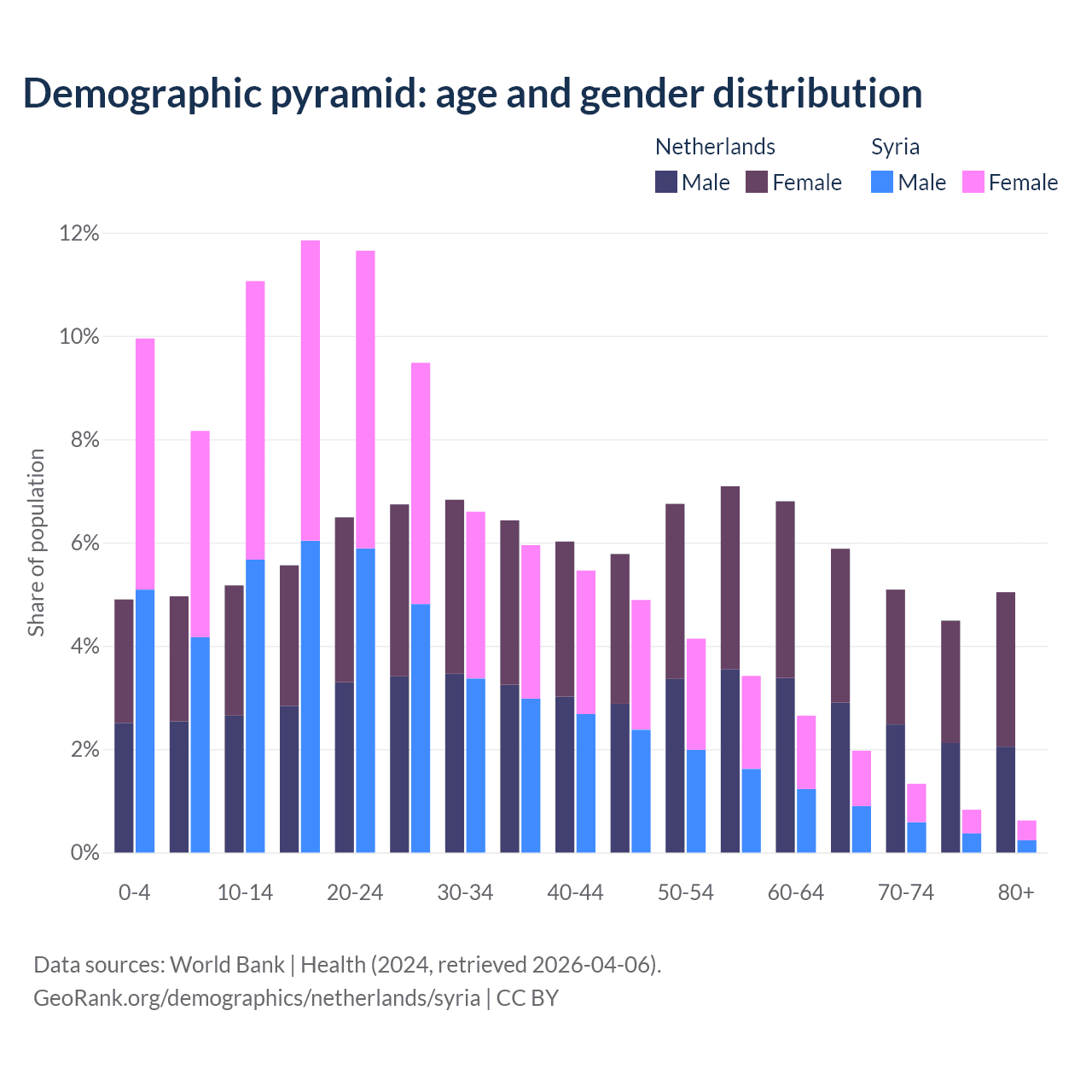 - The share of old-age demographic (65+) in the Netherlands is 20.5% vs 4.74% in Syria.