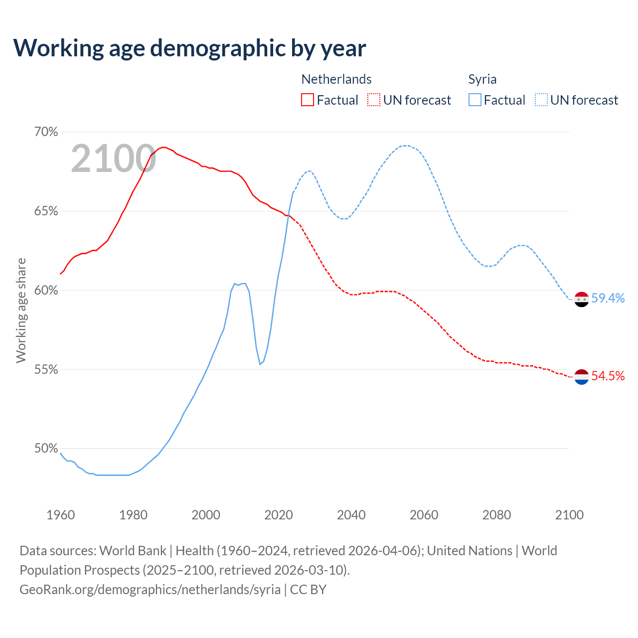Median age Netherlands vs Syria, 1960-2100