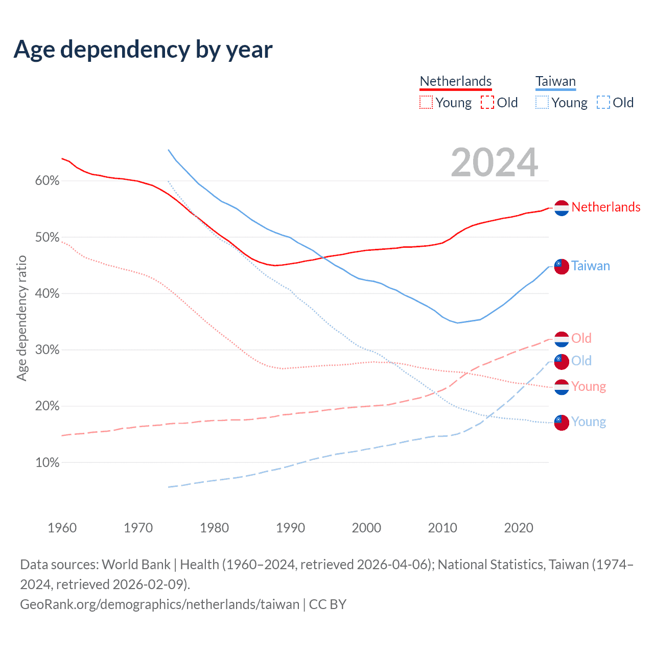 Data sources: World Bank | Health (1960–2024, retrieved 2026-04-06); U.S. Census Bureau (1960–2024, retrieved 2026-02-08); National Statistics, Taiwan (1974–2024, retrieved 2026-02-09).