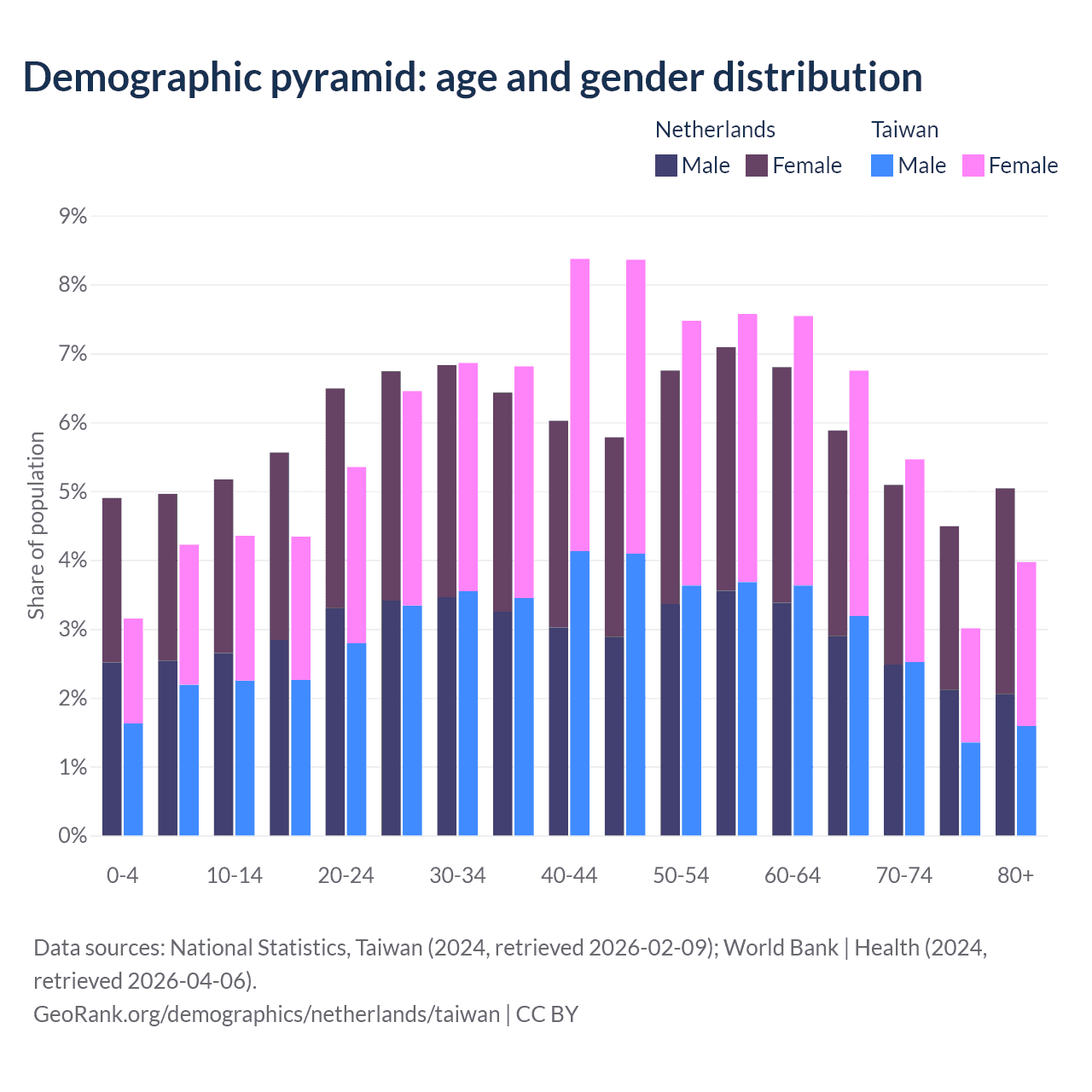 The share of older people aged 65 and over is 20.5% in the Netherlands and 19.2% in Taiwan. Life expectancy in the Netherlands compared to Taiwan .