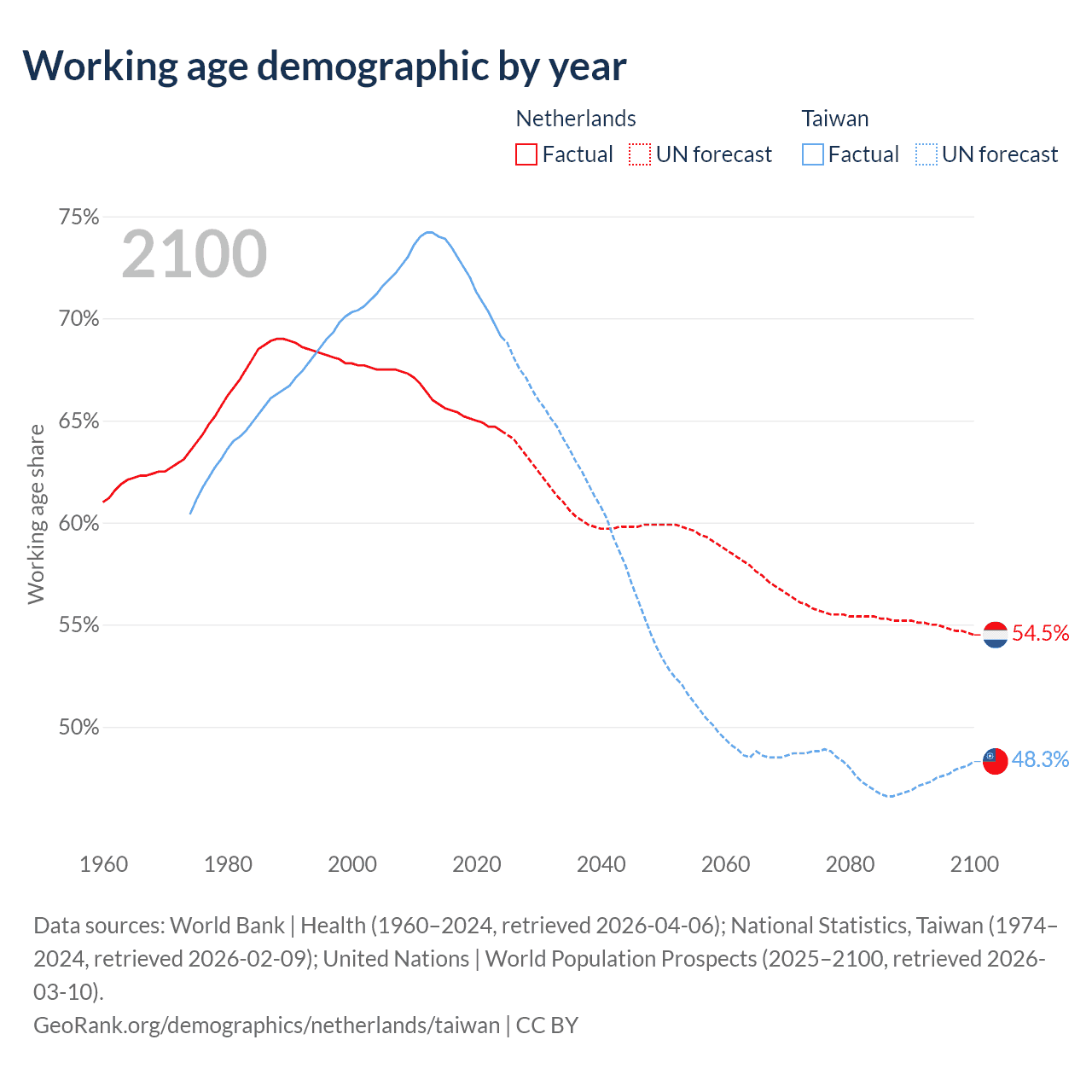 Median age Netherlands vs Taiwan, 1960-2100