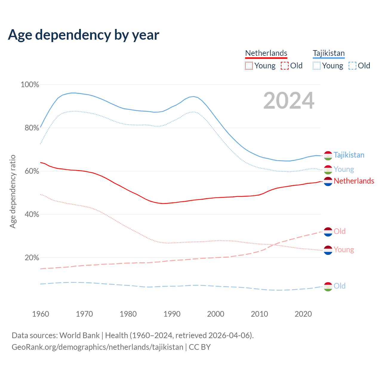 - The share of old-age demographic (65+) in the Netherlands is 20.5% vs 3.85% in Tajikistan.