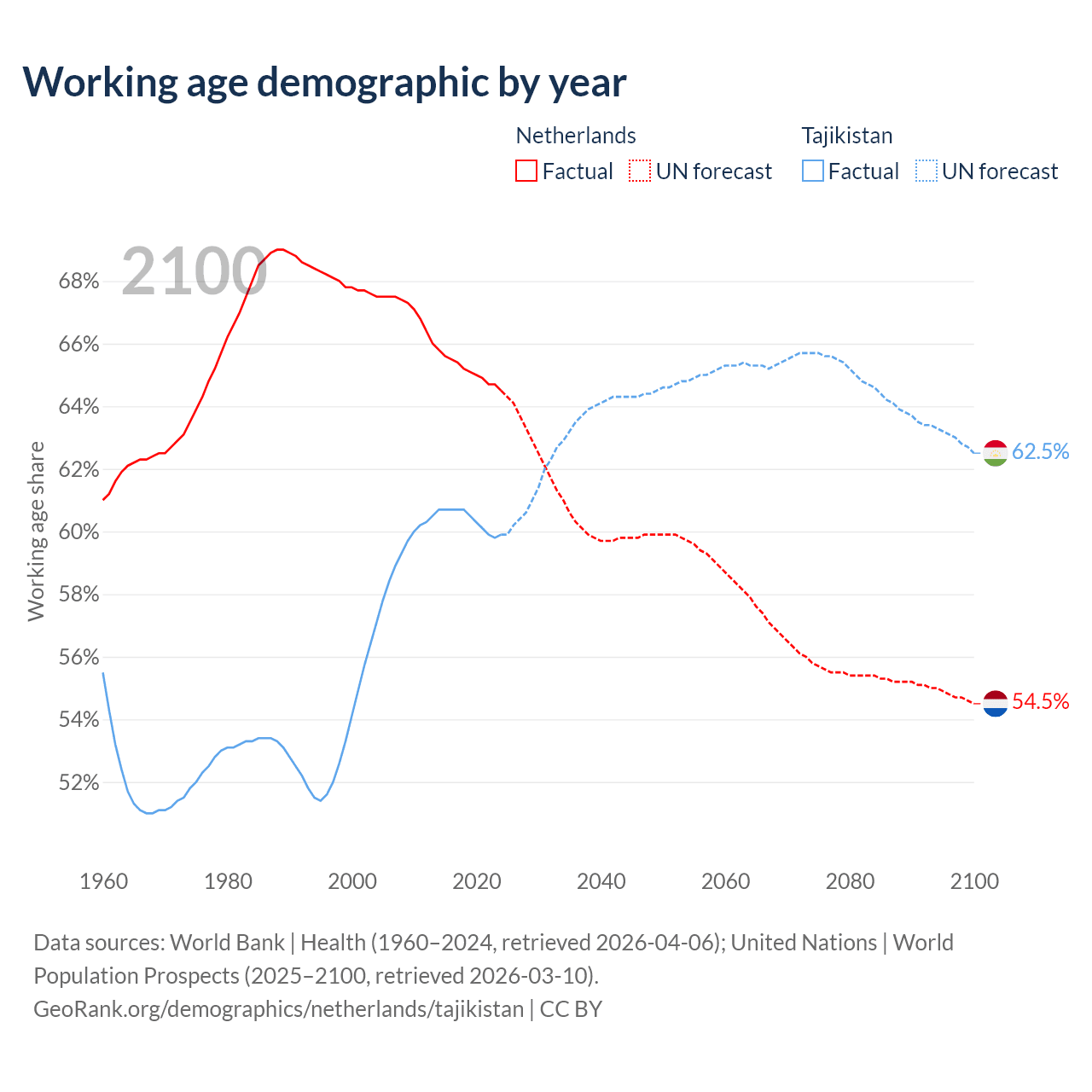 Median age Netherlands vs Tajikistan, 1960-2100