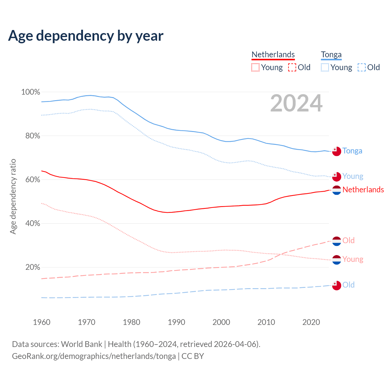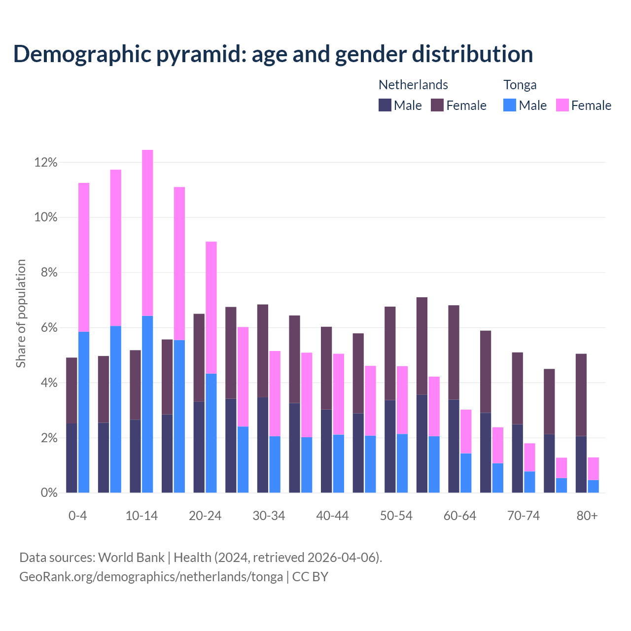 - The share of old-age demographic (65+) in the Netherlands is 20.5% vs 6.72% in Tonga.