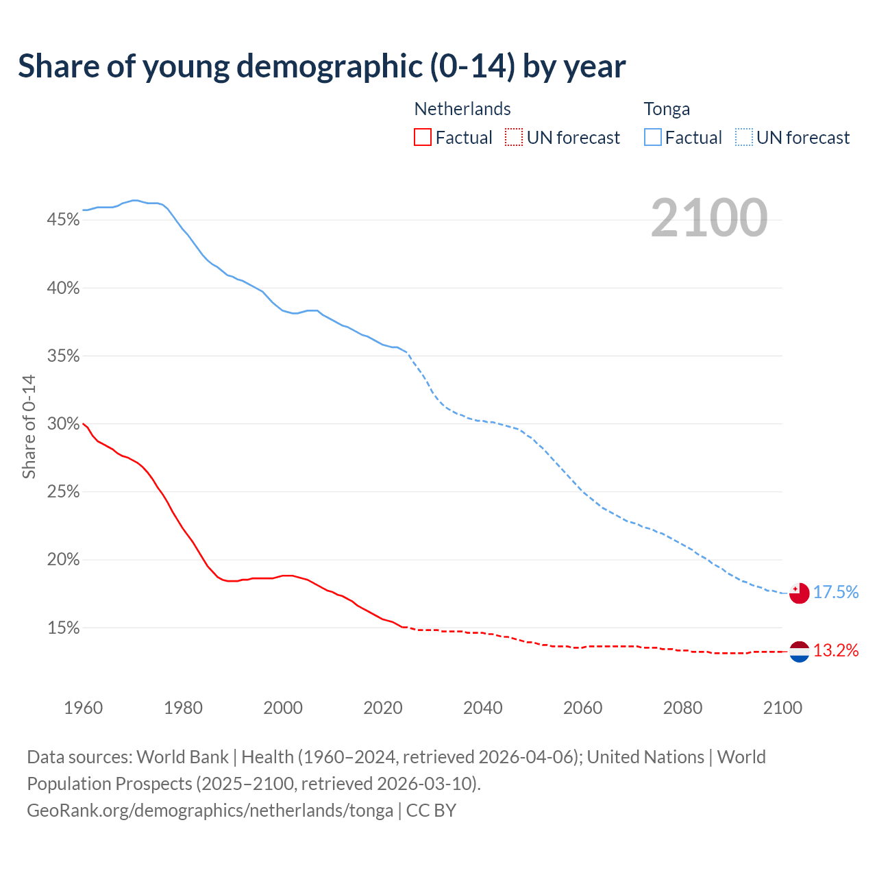 - The share of young demographic (0-15 years old) in the Netherlands is 15% vs 35.4% in Tonga.
