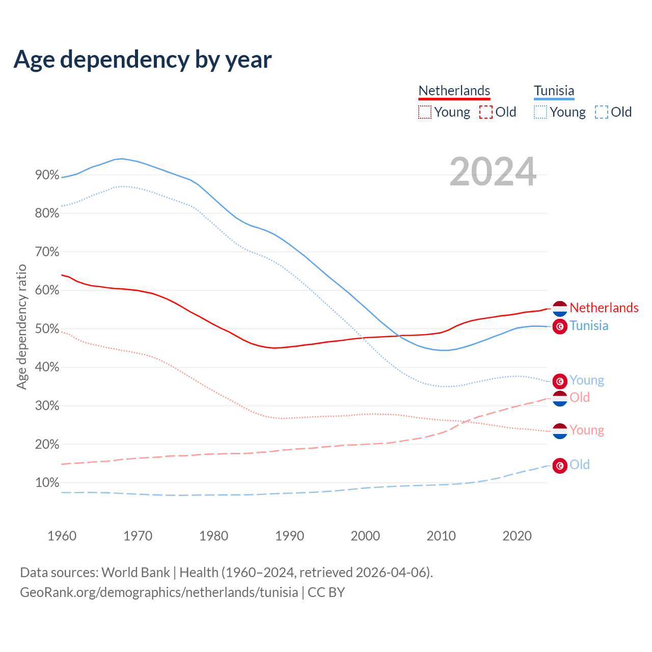- The Netherlands is ranked 33/196 by median age (oldest to youngest) vs 86/196 for Tunisia.
