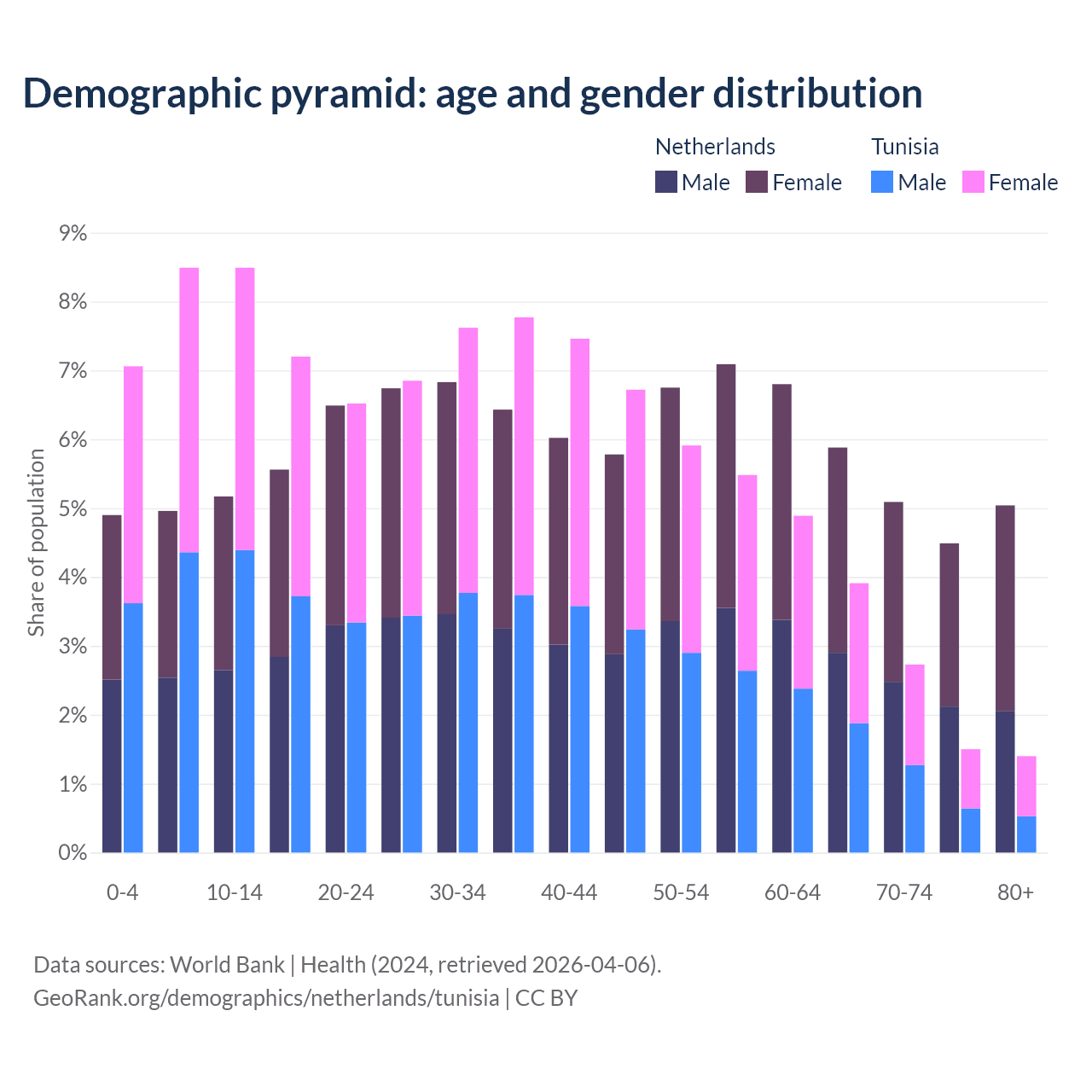 The share of older people aged 65 and over is 20.5% in the Netherlands and 9.53% in Tunisia. Life expectancy in the Netherlands compared to Tunisia .
