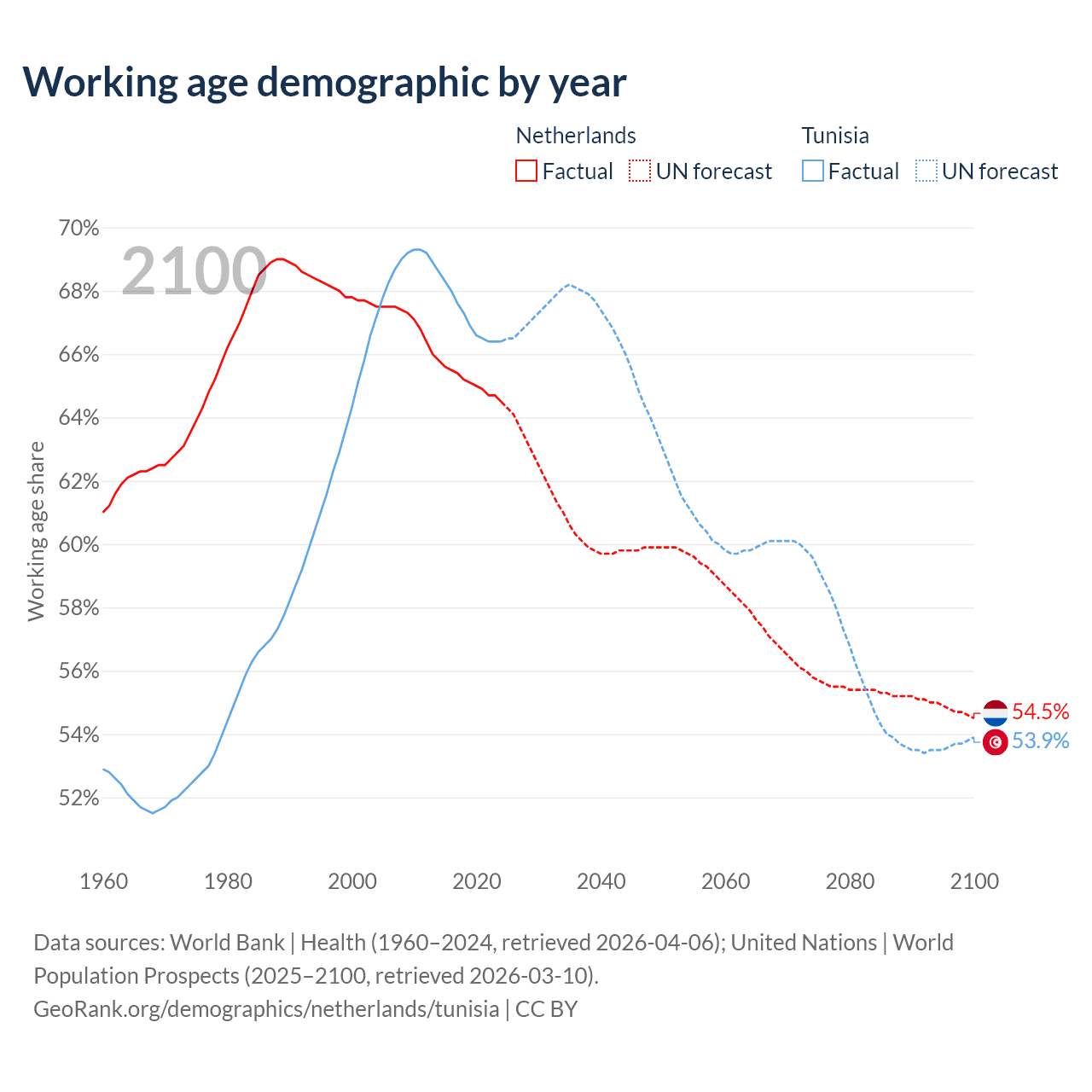 Median age Netherlands vs Tunisia, 1960-2100