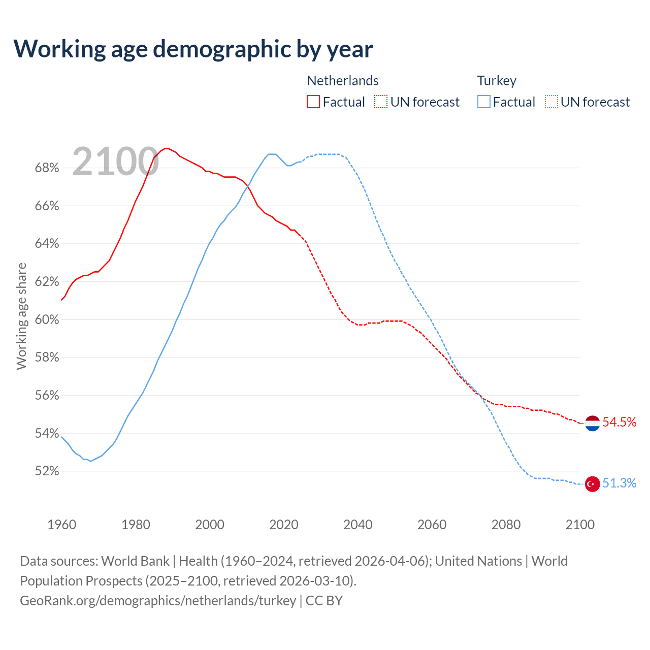 - The Netherlands has 11.8M working age adults (aged 15-64) vs 58.7M in Turkey.