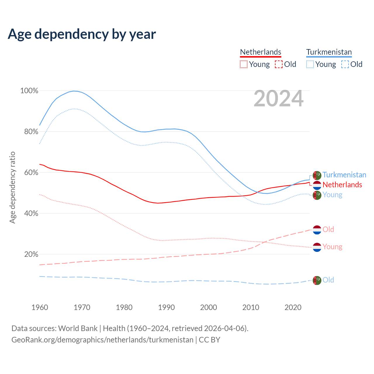 - The Netherlands is ranked 33/196 by median age (oldest to youngest) vs 119/196 for Turkmenistan.