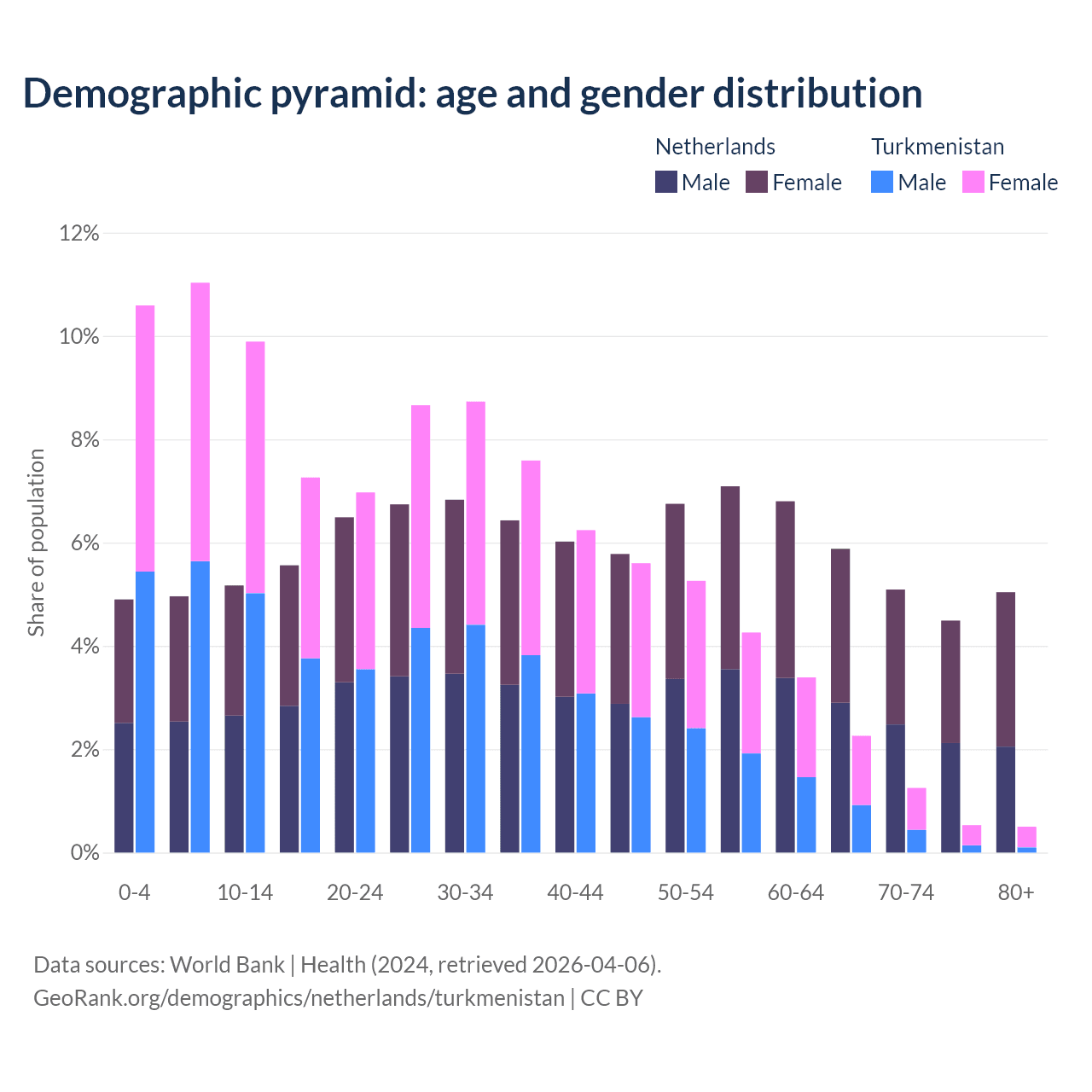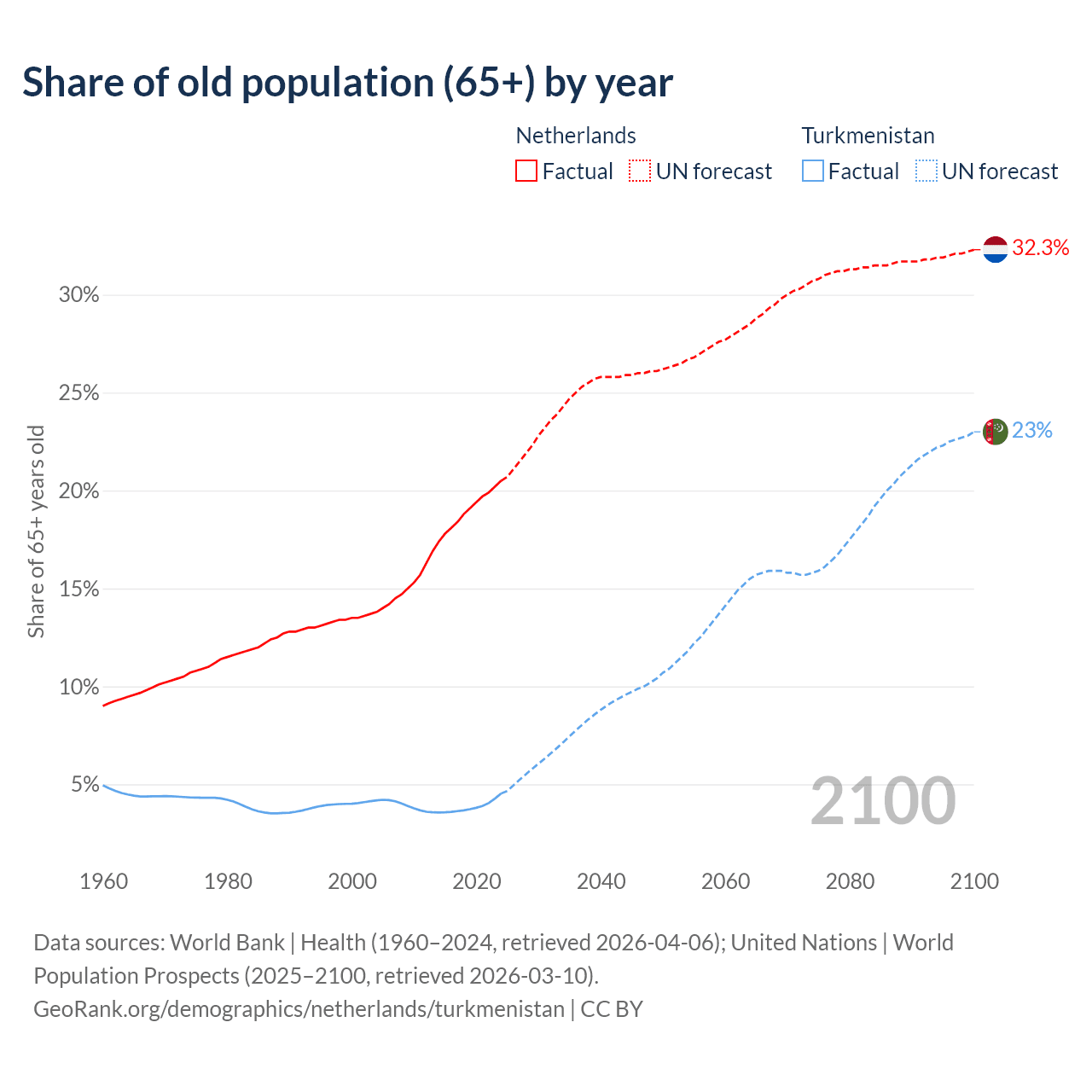 - The share of old-age demographic (65+) in the Netherlands is 20.5% vs 4.53% in Turkmenistan.