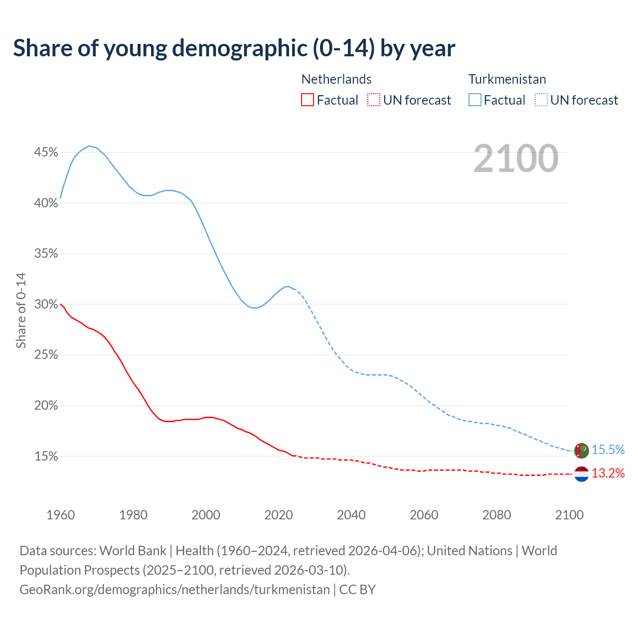 - The share of young demographic (0-15 years old) in the Netherlands is 15% vs 31.5% in Turkmenistan.