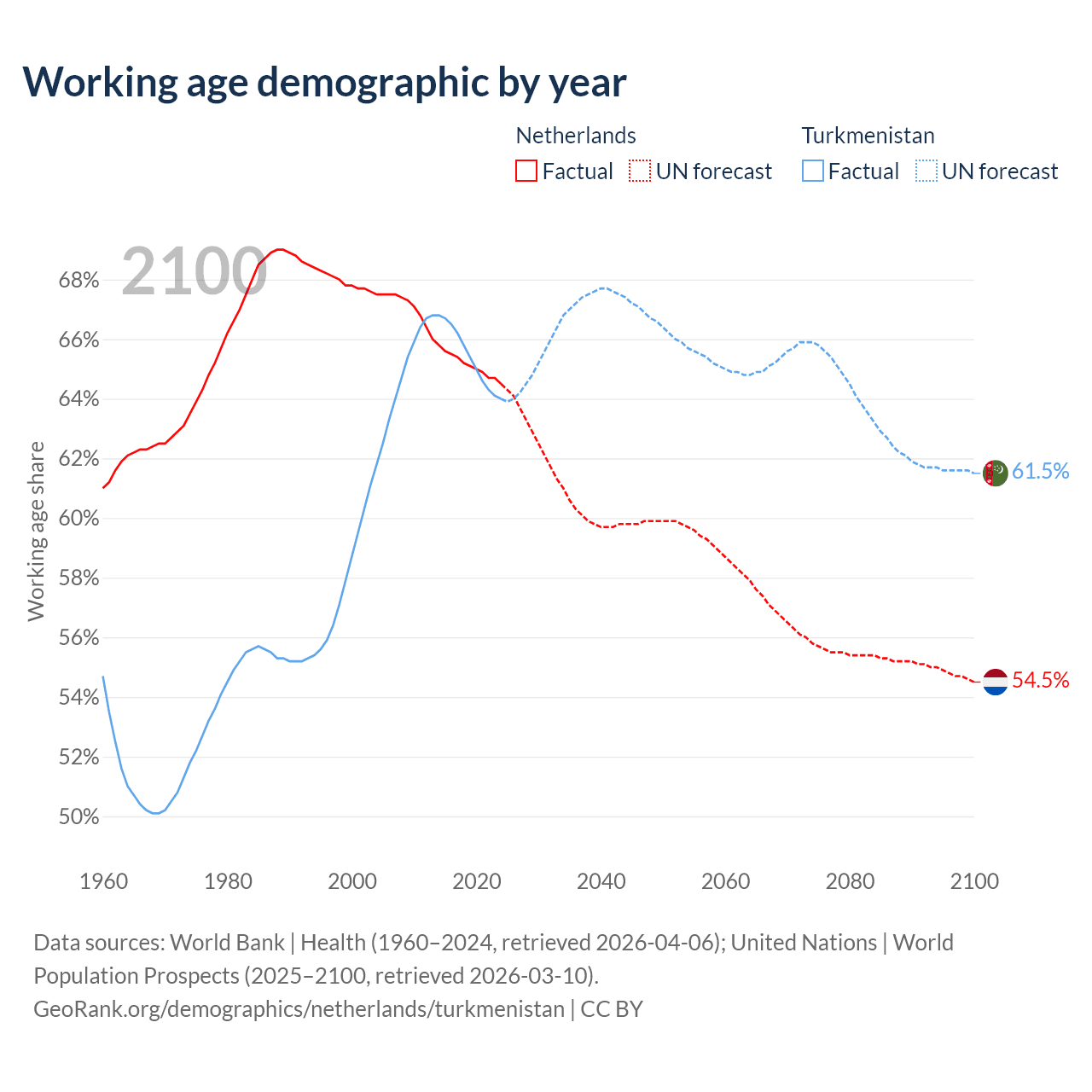 Median age Netherlands vs Turkmenistan, 1960-2100