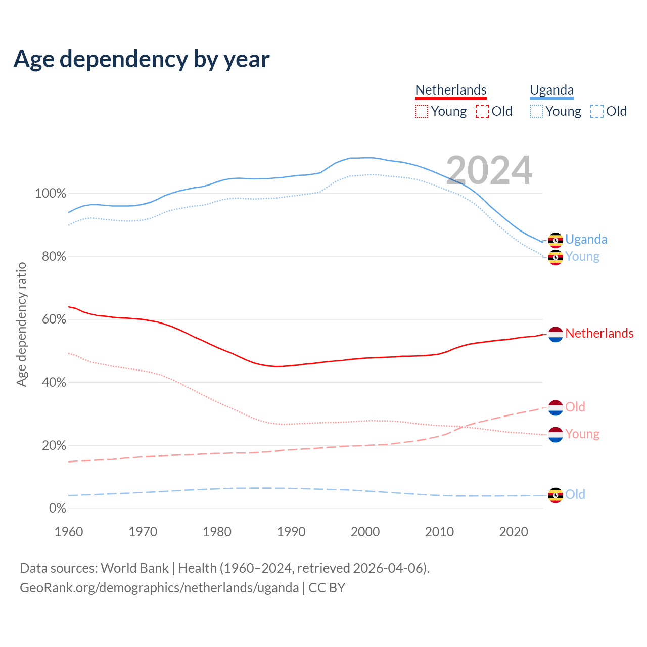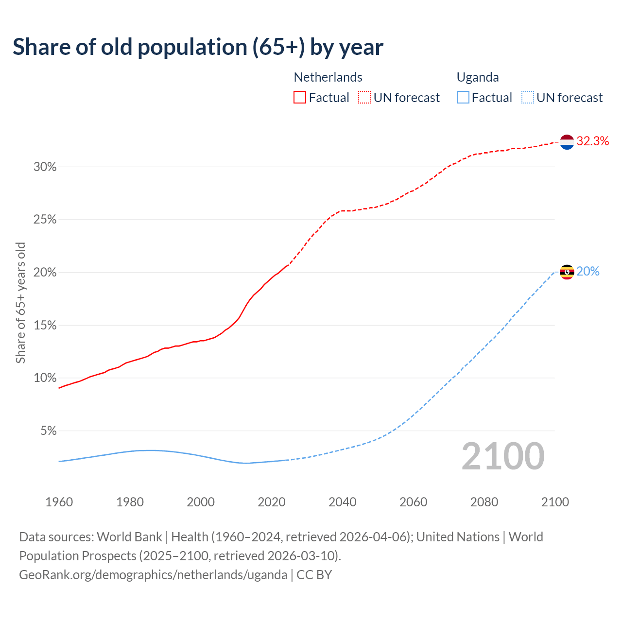 - The share of old-age demographic (65+) in the Netherlands is 20.5% vs 2.19% in Uganda.
