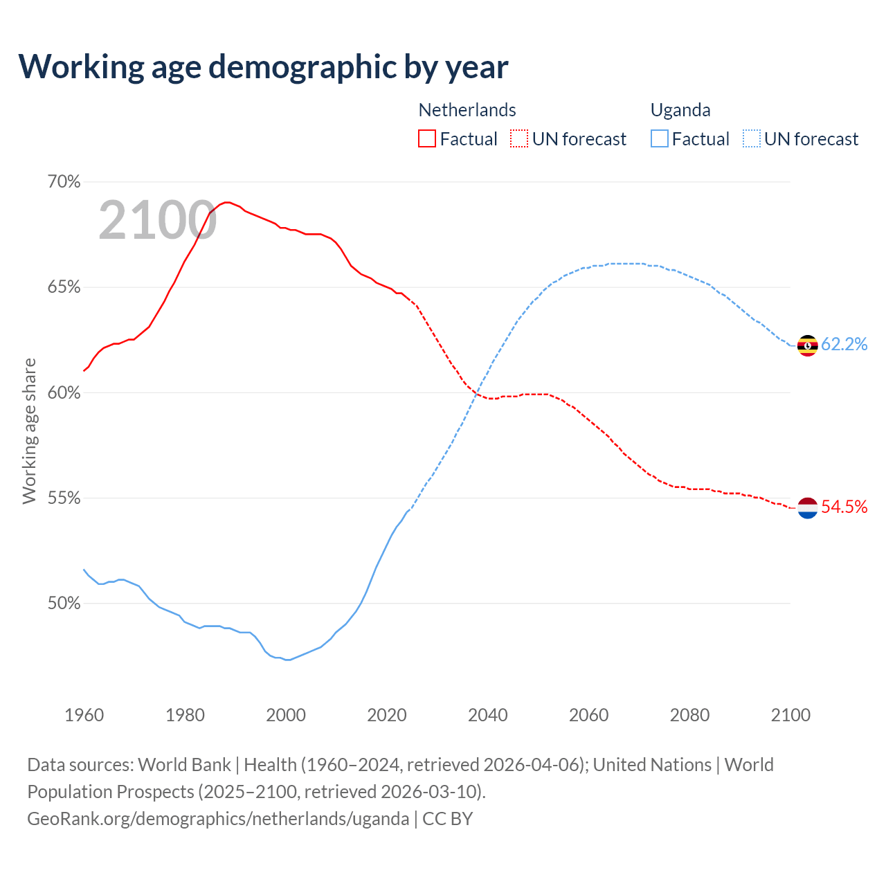 Median age Netherlands vs Uganda, 1960-2100