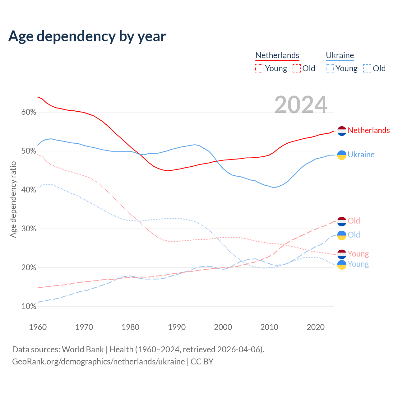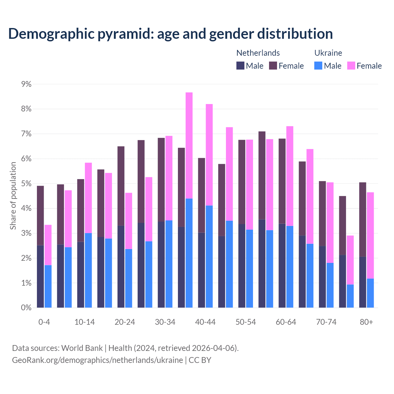 - The Netherlands is ranked 33/196 by median age (oldest to youngest) vs 26/196 for Ukraine.