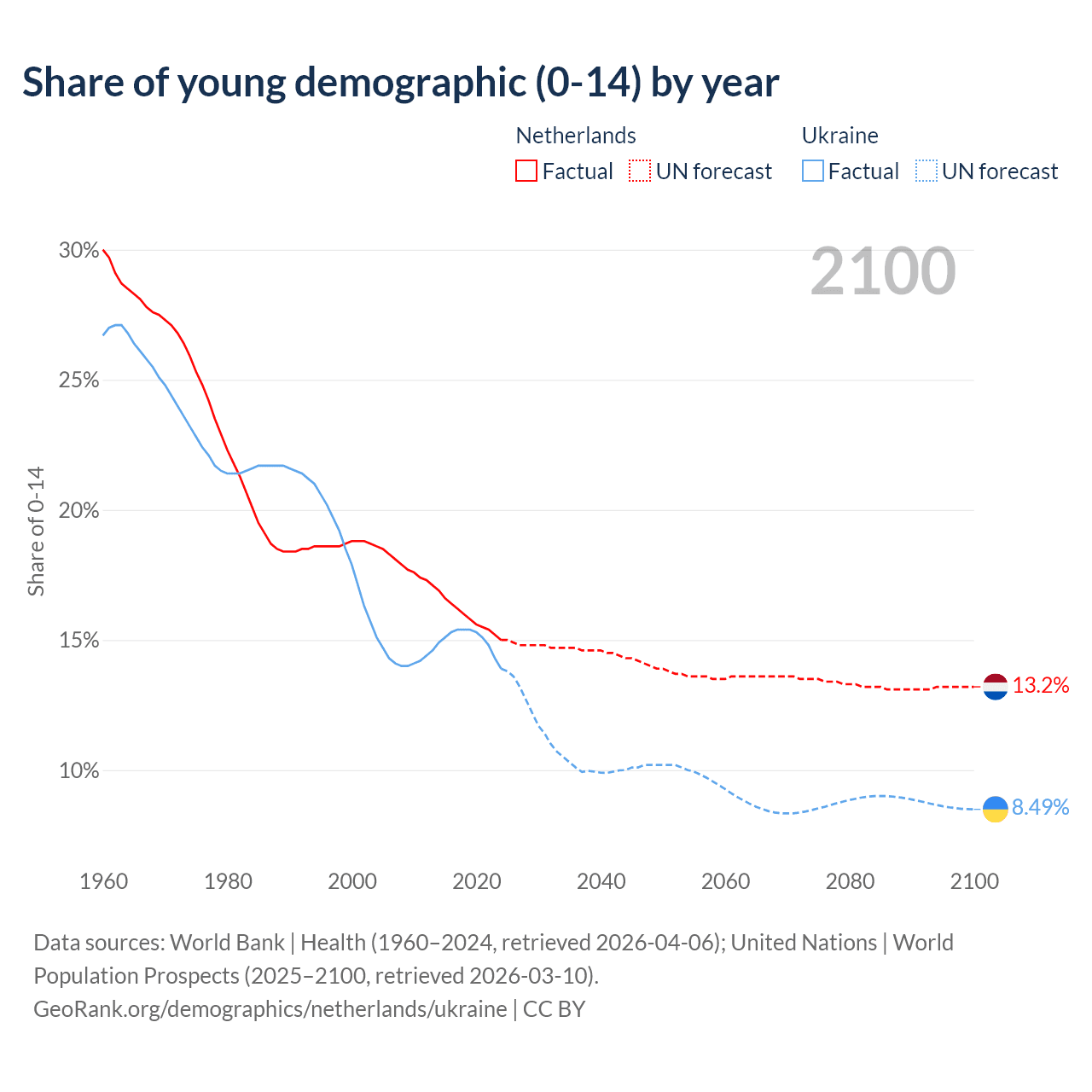 - The share of young demographic (0-15 years old) in the Netherlands is 15% vs 13.9% in Ukraine.