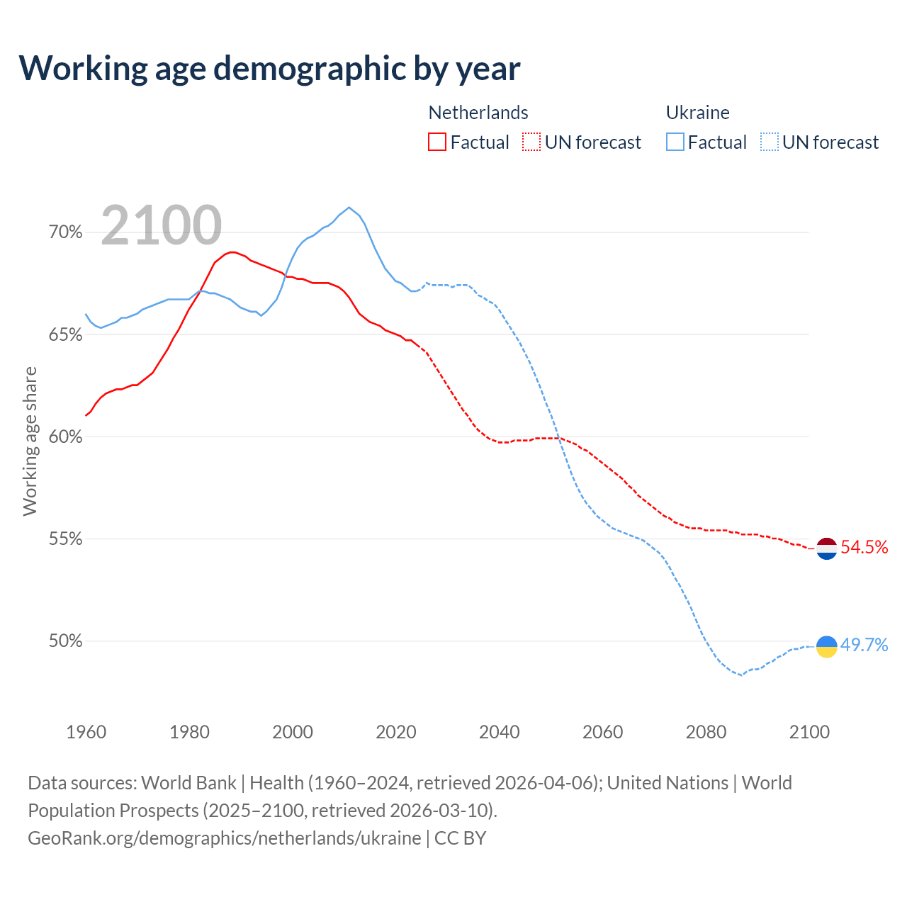 - The Netherlands has 11.8M working age adults (aged 15-64) vs 26.9M in Ukraine.