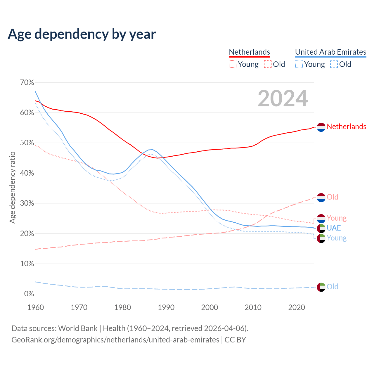 - The Netherlands is ranked 33/196 by median age (oldest to youngest) vs 91/196 for the United Arab Emirates.