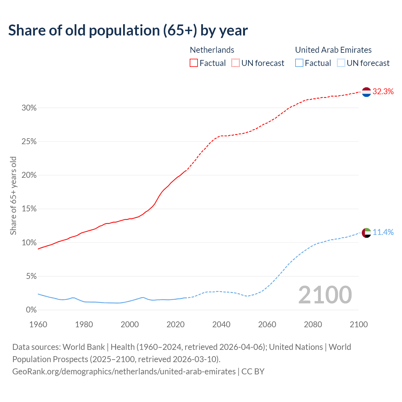 The share of older people aged 65 and over is 20.5% in the Netherlands and 1.77% in the United Arab Emirates. Life expectancy in the Netherlands compared to the United Arab Emirates .